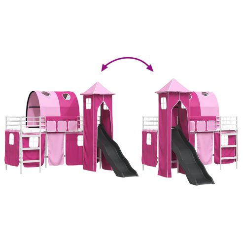 Dieser moderne Hochbett-Rahmen mit Vorhängen, Turm und Rutsche ist die perfekte Lösung für coole Kinderzimmer. Das frische Design sorgt dafür, dass es überall gut aussieht. Mit dem tollen Turm und der aufregenden Rutsche wird die Schlafenszeit zum Erlebnis. Das durchdachte Design macht es möglich, den Platz optimal zu nutzen und passt super zum aktiven Lebensstil von Kindern, denn es fördert Fantasie und Kreativität. So wird das Möbelstück zum echten Highlight im Kinderzimmer. Robuster Metallrahmen: Dieser Metallrahmen ist extrem stabil und hält den Abenteuern aktiver Kinder stand. Die matte Oberfläche sieht super aus und passt zu jedem Kinderzimmer-Stil. Sicherheit und Stabilität sind auch wichtig – das Bett ist darauf ausgelegt, den täglichen Gebrauch zu überstehen. Spannende Rutsche und Turm: Mit der integrierten Rutsche und dem Turm wird das Schlafzimmer zum Spielplatz. Die Elemente fördern kreatives Spielen und machen es zu mehr als nur einem Bett – hier wird Lernen mit Spaß kombiniert. Funktionale Vorhänge: Das Bett hat Vorhänge, die einfach zu handhaben sind und für einen ordentlichen Look sorgen. Die coolen blauen und schwarzen Farben der Vorhänge bringen ein bisschen Geheimnis und bieten gleichzeitig die Privatsphäre, wenn nötig. Der Bogen versteckt die Montage und sieht dazu noch gut aus. Matte Oberfläche: Die matte Lackierung hält Fingerabdrücke und Staub fern und sieht einfach schick aus. Das Design ist zeitlos und passt wunderbar in moderne Räume, während die Pflege minimal bleibt. Einfach zu reinigen: Für die Pflege reicht ein feuchtes Tuch, ohne aggressive Chemikalien. Befolge die Montageanweisung des Herstellers, um die Möglichkeiten des Bettes optimal zu nutzen und seine Lebensdauer zu verlängern. So ist es eine langlebige Wahl für Familien. ** Farbe: Weiß und Rosa ** Rahmenmaterial: Metall ** Gesamtabmessungen: 194 x 80 x 116 cm (L x B x H) ** Matratzengröße: Kurzes Einzelbett (90 cm x 190 cm oder 35" x 75") ** Zusammenklappbar ** Montage erforderlich: Nein