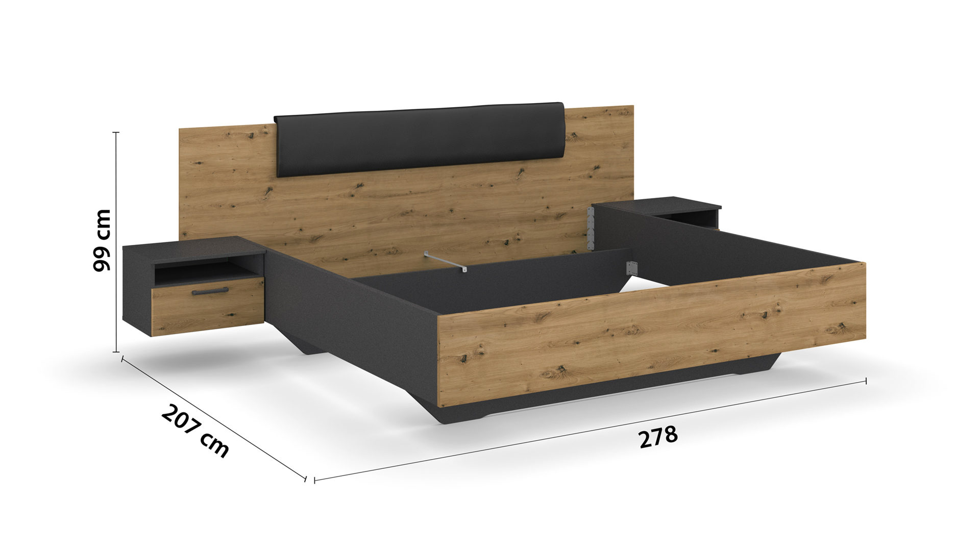 Das Doppelbettgestell ist nicht nur optisch ein Highlight, sondern bietet auch höchsten Komfort und Funktionalität. Mit einer Liegefläche von ca. 180 x 200 cm und Gesamtmaßen von ca. 278 x 99 x 207 cm (BxHxL) bietet es ausreichend Platz für zwei Personen. Zwei Hängenachttische sind inklusive und bieten praktische Ablagemöglichkeiten für Ihre persönlichen Gegenstände.