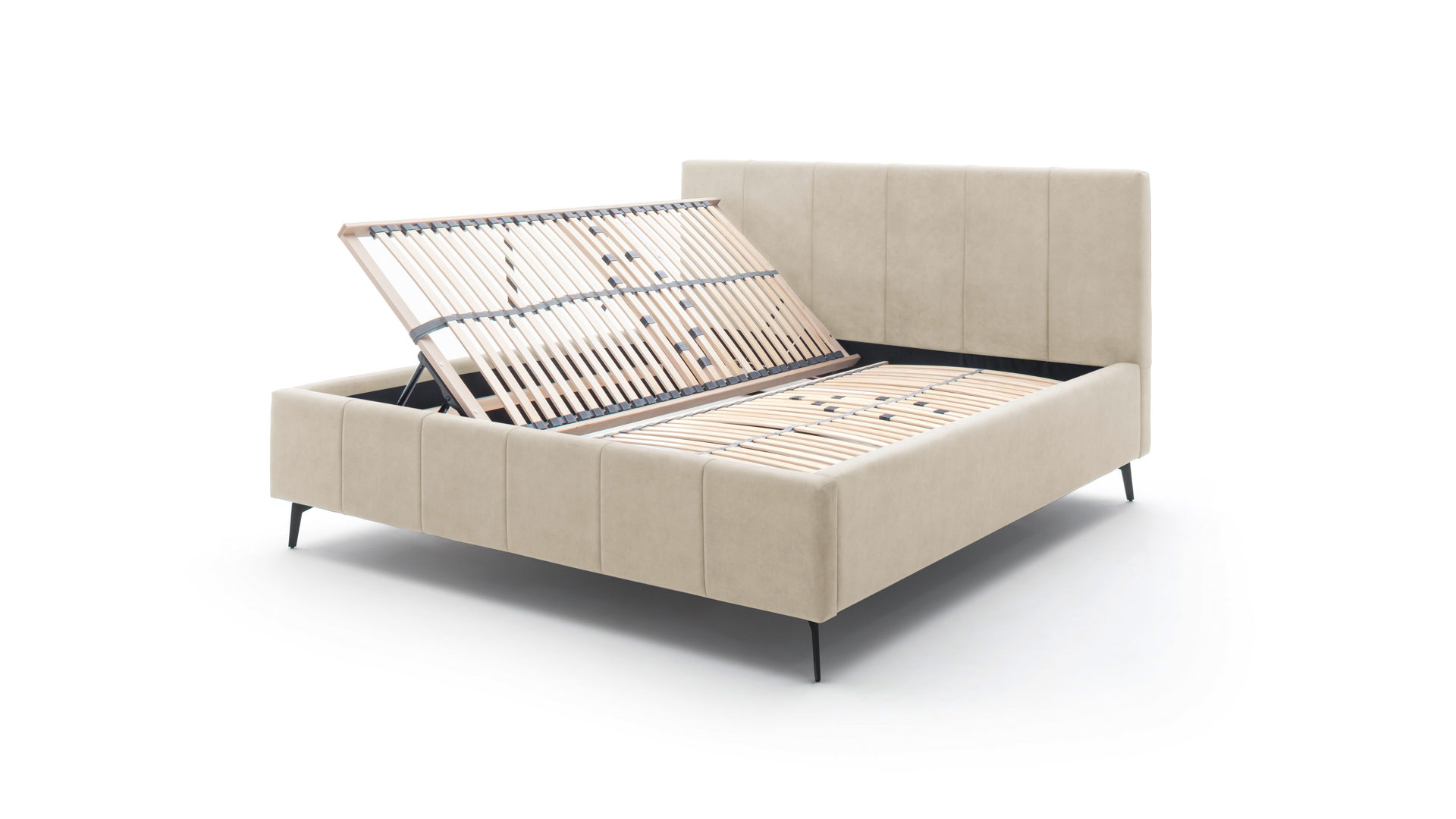 Das Polsterbettgestell Lizzano kommt im zeitlos schicken Design. Von den filigranen, schwarz lackierten Metallfüßen bis hin zum beigen Samtbezug Cloud 03 strahlt das Bett eine dezente Eleganz aus. Damit passt es in nahezu jedes Interieur: Mit einer romantisch angehauchten Schlafzimmereinrichtung harmoniert es ebenso wie mit geradlinigem Minimalismus.