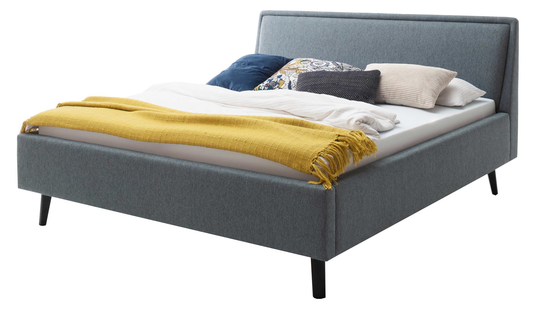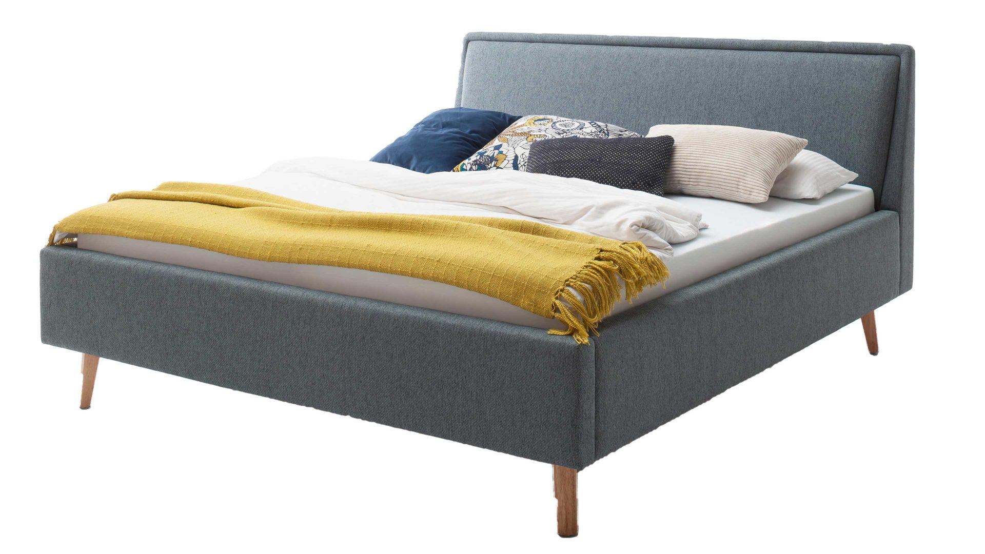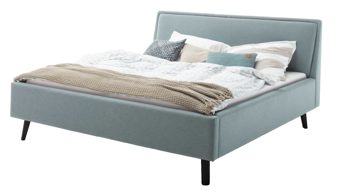 Das Polsterbettgestell Mattis begeistert durch die elegante Optik sowie die hervorragende Material- und Verarbeitungsqualität. Es kombiniert einen eisblauen Flachgewebe-Bezug mit eichefarbenen Holzfüßen. Sowohl die Bettseiten als auch das Polsterkopfteil sind glatt bezogen. Letzteres lädt Sie ein, sich anzulehnen, wenn Sie abends im Bett vor dem Schlafen noch fernsehen oder in einem Buch lesen.
