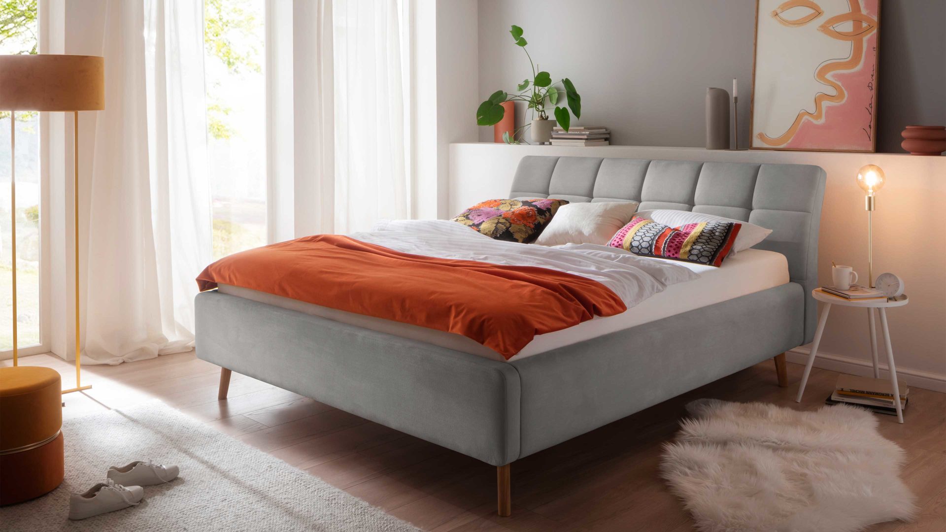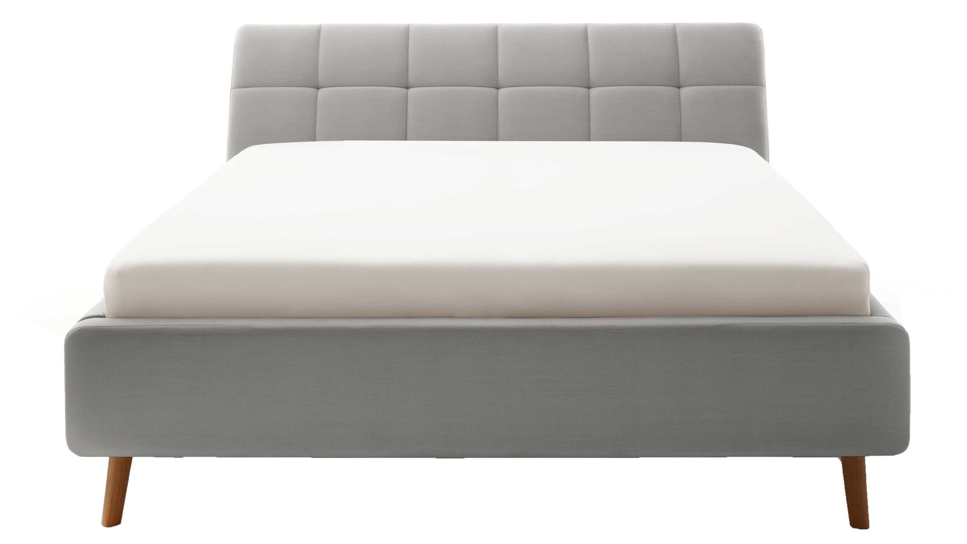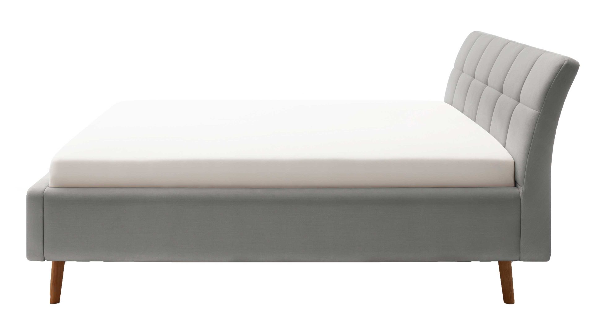 Pure Eleganz bringt das Polsterbettgestell Mila in Ihr Schlafzimmer. Die eichefarbenen Füße wirken filigran und verleihen diesem Modell eine luftig leichte Ausstrahlung. Ausgestattet ist das schicke Bett mit dem Bezug Capri 4150 aus hellgrauem Flachgewebe.
