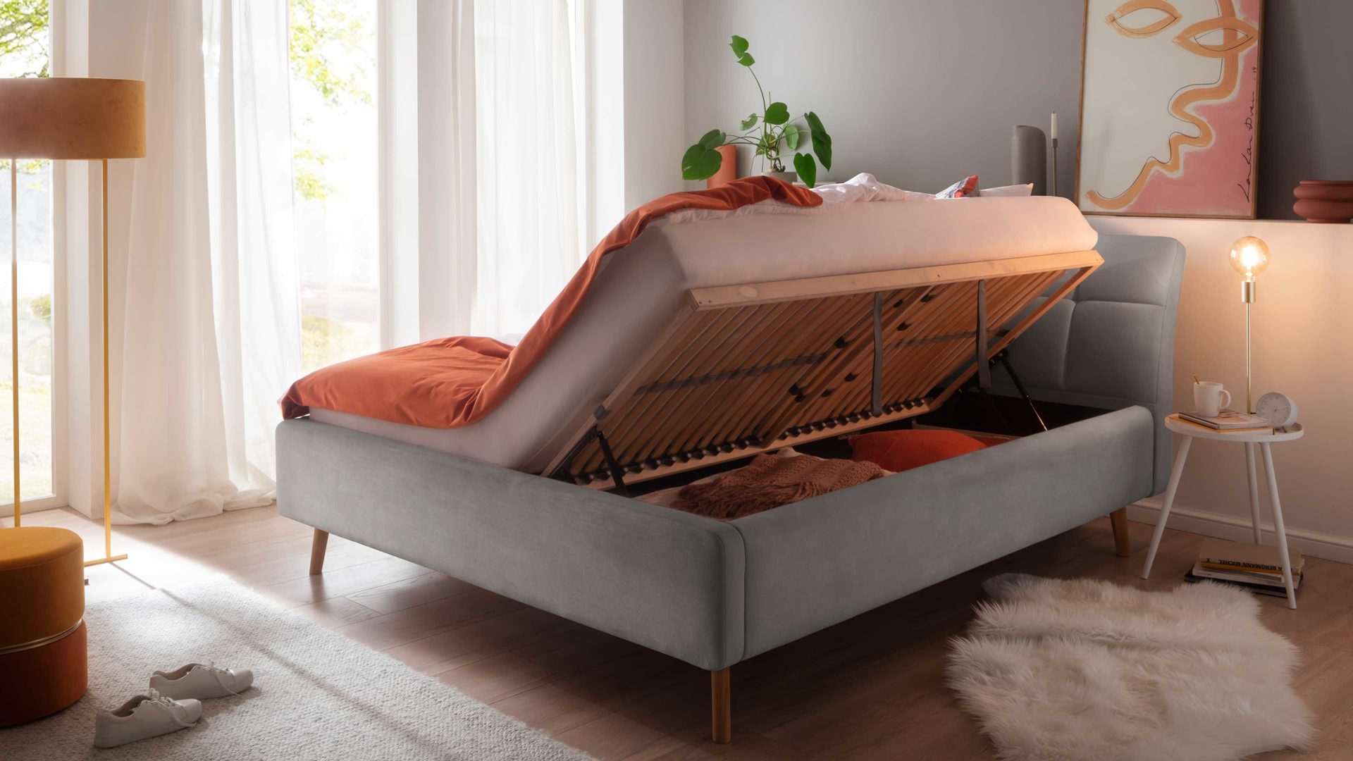 Im Inneren liegen zwei jeweils seitlich zu öffnende Federholzrahmen mit 28 starren Leisten. Dank der möglichen Härtegradverstellung liegen Sie immer genau richtig. Der integrierte Bettkasten ist belüftet und geteilt - für eine Extramaß an Ordnung und Stauraum bei dennoch optimaler Luftzirkulation.