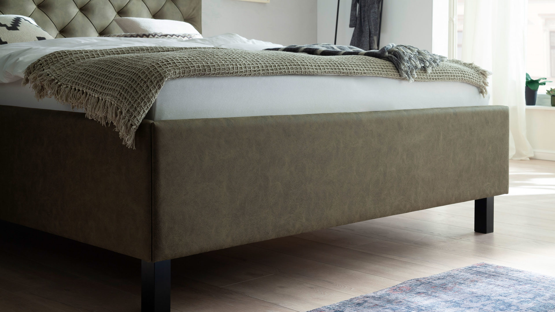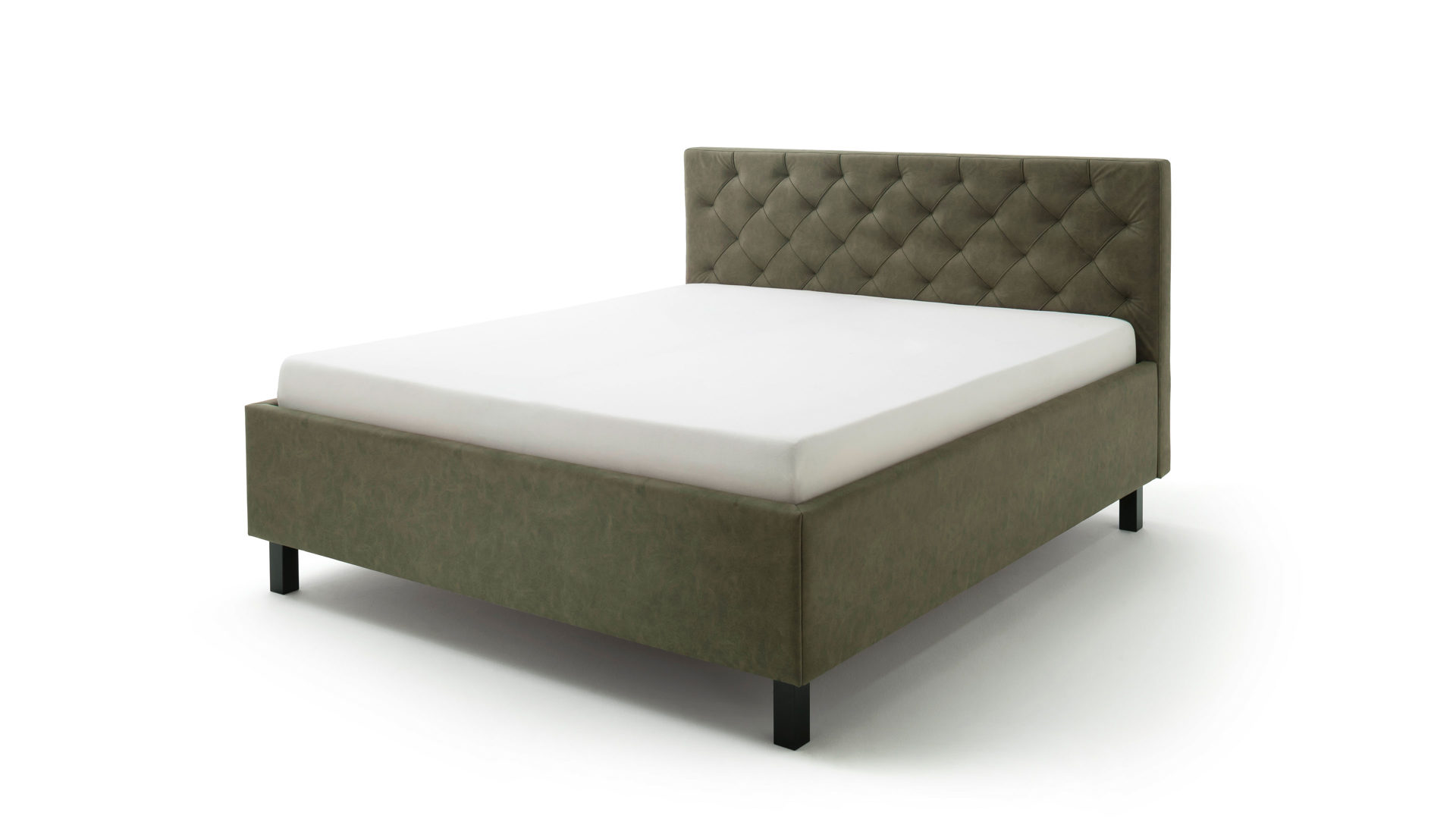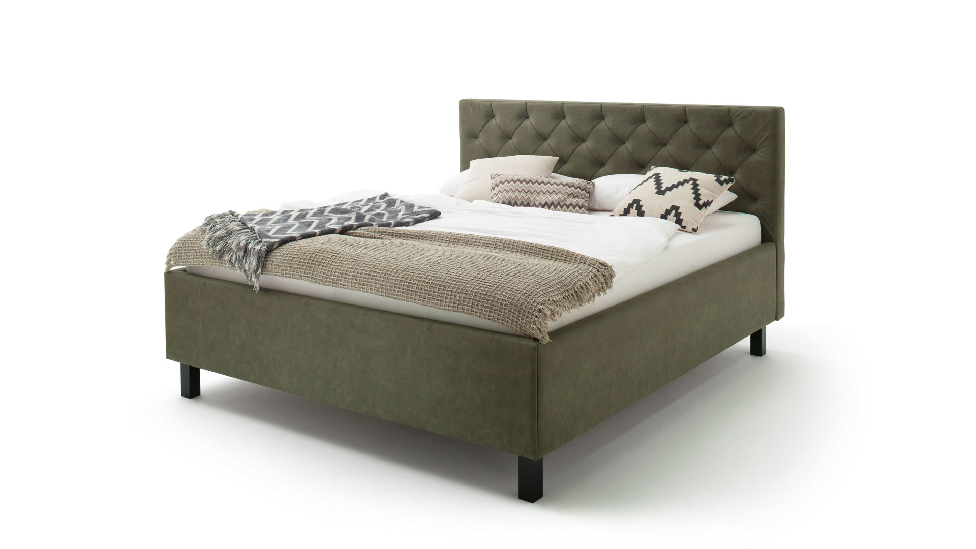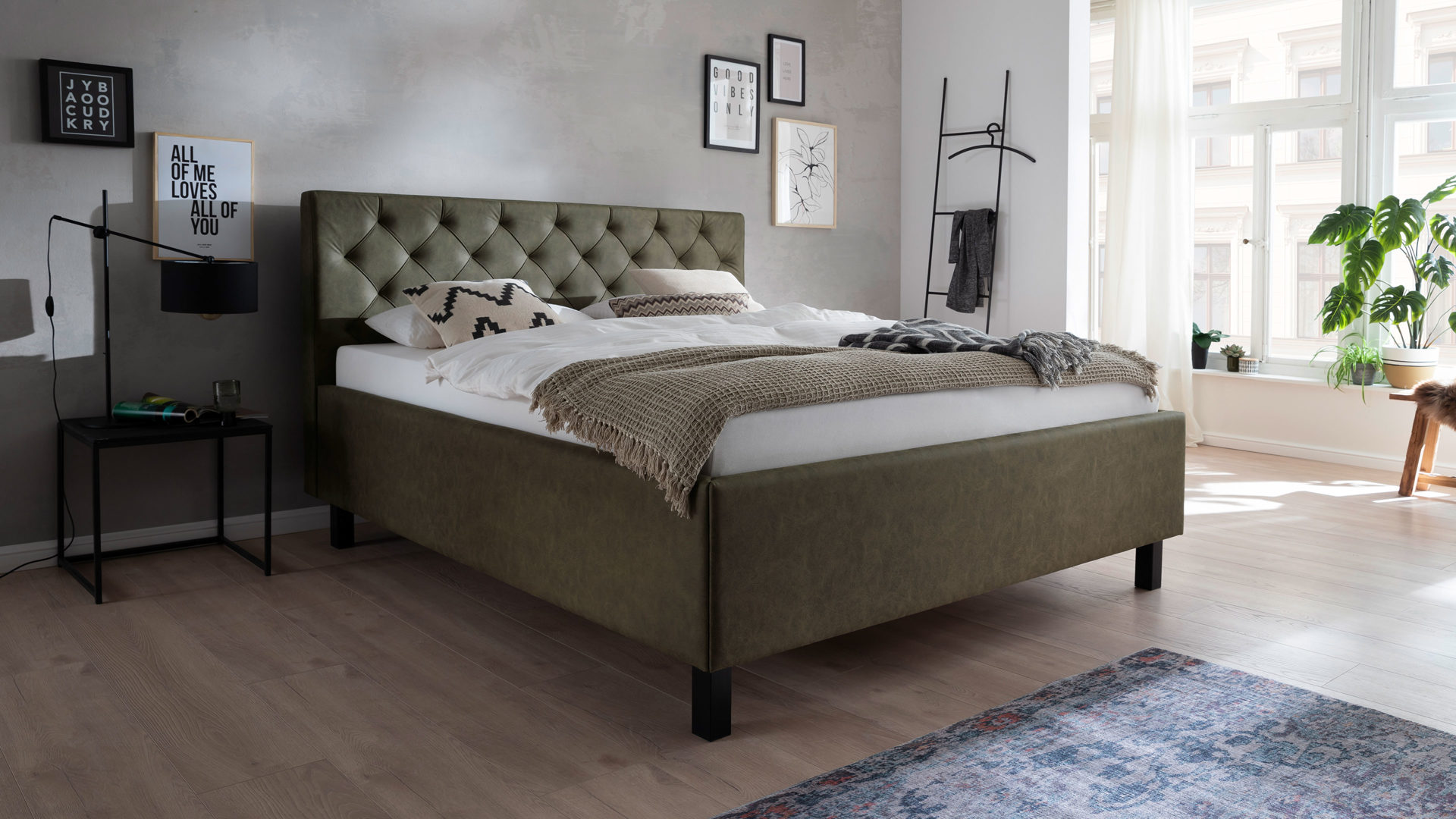 Das Polsterbettgestell San Remo bringt einen zeitlosen Chic mit. Sein grüner Mikrofaserbezug Bulus 17 trifft auf Holzfüße in dezentem Schwarz. Abgerundet wird das edle Design von dem gesteppten Kopfteil mit Rautenmuster. Es entsteht ein stilvoller Look voll frischer Eleganz.