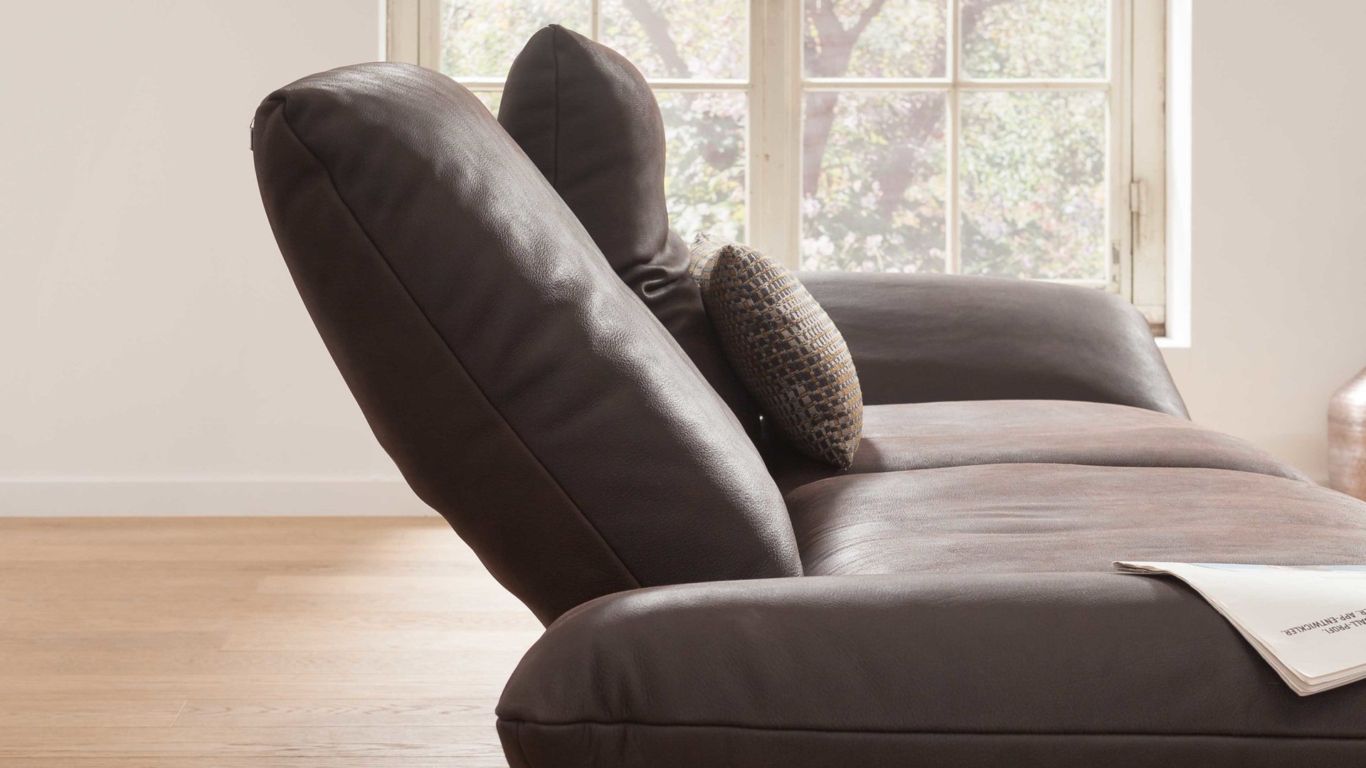 Für den gewünschten Sitzkomfort zeichnet neben der außerordentlich angenehmen Haptik des Echtlederbezugs in erster Linie die lässig-legere Polsterung mit weichem Polsteraufbau und edler Kammerabsteppung verantwortlich. Weitere den Komfort fördernde Eigenschaften sind die mehrfach manuell verstellbaren Funktionsarmlehnen sowie die Kopfteil- und Rückenverstellungen mittels Rasterbeschlag.