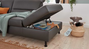 • Die Abbildung zeigt ein Wohnbeispiel, welches auch Dekoration sowie separat erhältliches Zubehör enthält. Im Lieferumfang enthalten ist ein Einsitzer-Kombielement mit Anstellhocker links, ein 2,5-Sitzer-Zwischenelement ohne Armlehnen und ein Canapé mit Armlehne rechts.
