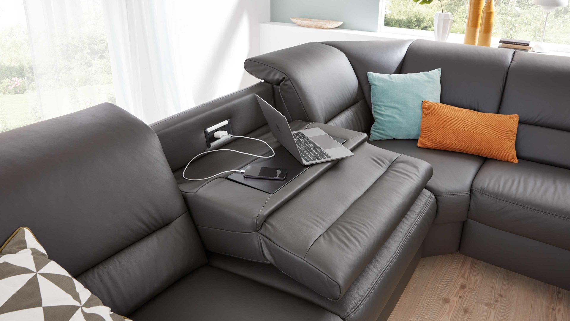 So entsteht eine stabile Ablagefläche, auf der Sie beispielsweise Ihr Notebook oder Mobiltelefon, aber ebenso Getränke und Snacks bequem abstellen können. Gleichzeitig werden die integrierten Funktionsbuchsen frei zugänglich: eine Steckdose sowie ein USB-Anschluss. Die Ablageplatte ist jeweils dem Farbton der Füße angepasst, um eine harmonische Optik zu gewährleisten.