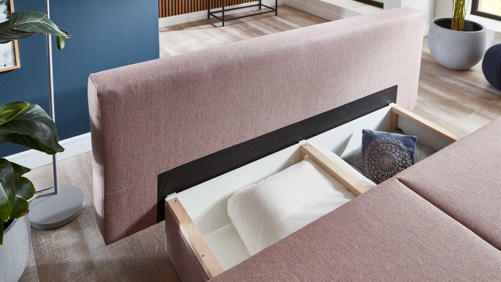 Das Schlafsofa Sweet begeistert mit dem eleganten Design und extra hohen Komfort sowie mit der praktischen Querschläferfunktion. Es kombiniert einen roséfarbenen Stoffbezug mit schwarzen Metallfüßen - Materialien und Farben, die perfekt harmonieren und dem Sofa eine moderne und freundliche Ausstrahlung verleihen. Die Rückseite ist ebenfalls im Originalstoff bezogen.