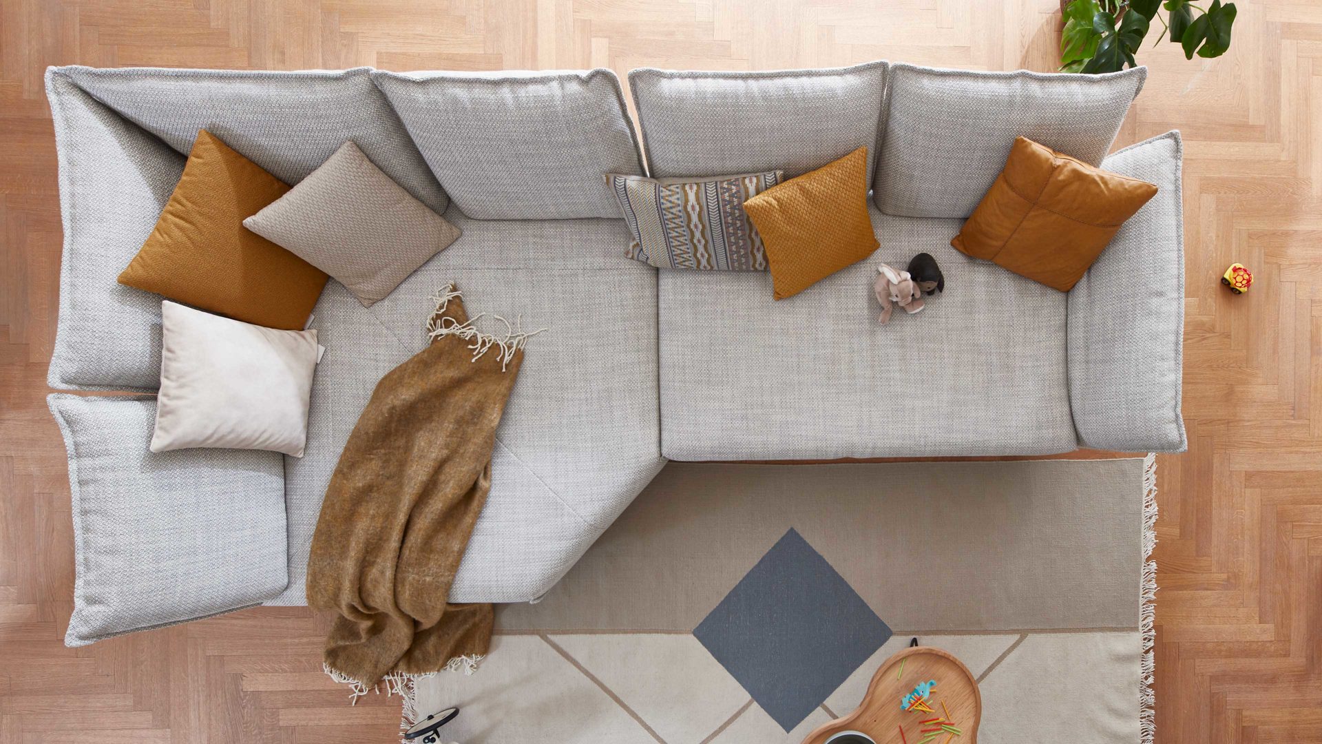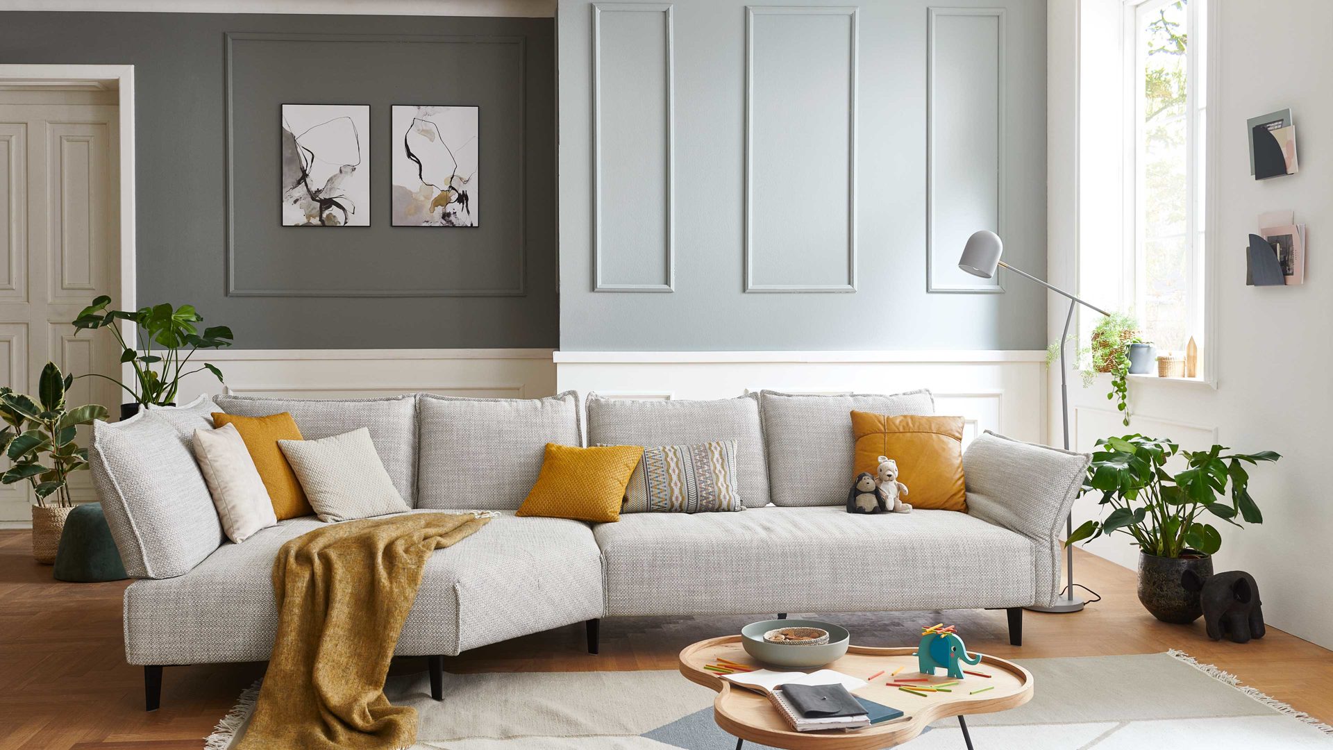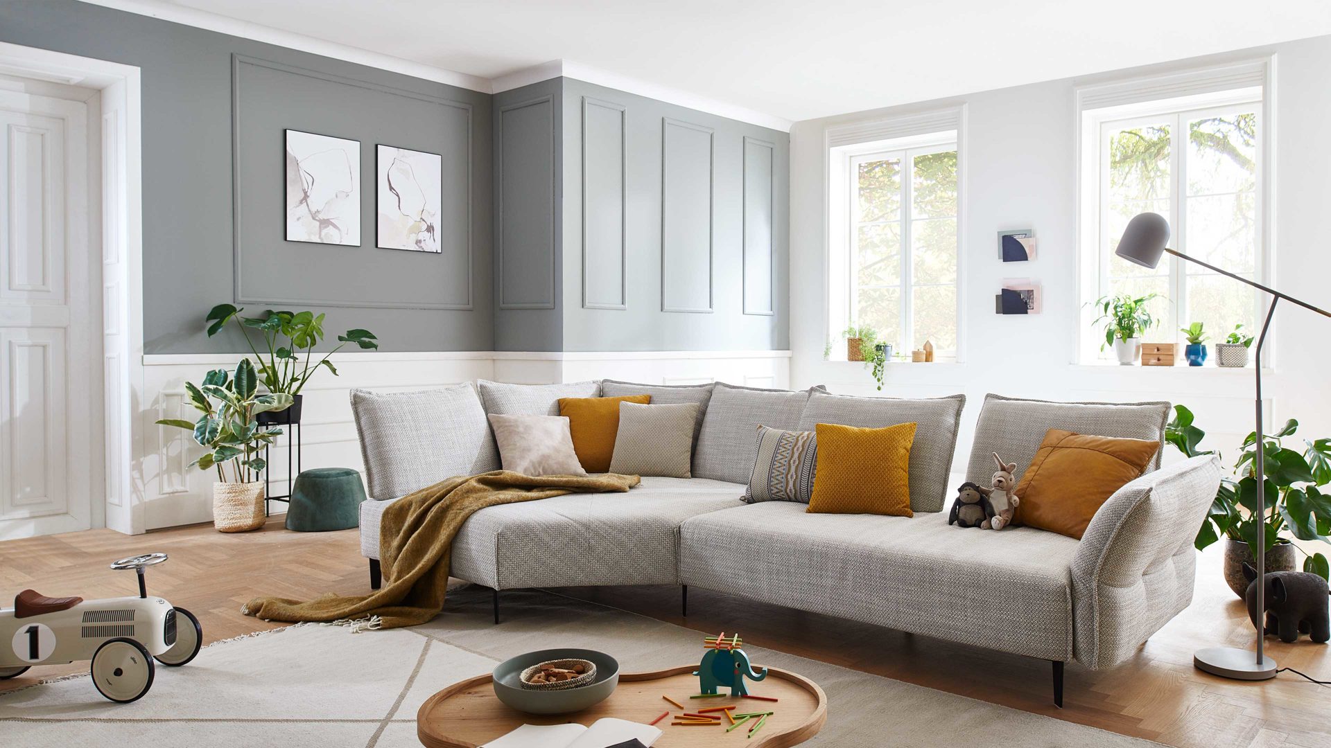 Bei diesem Modell handelt es sich um eine zweiteilige Eckkombination, die sich aus einer Kuschelecke und einem großen Sofa mit Armlehne rechts zusammensetzt. Das Sofaelement ist mit einer einfach zu bedienenden Sitztiefenverstellung für ein Plus an Komfort ausgestattet.