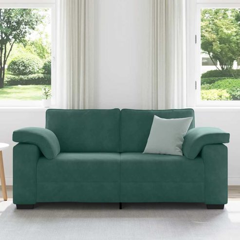 Erlebe außergewöhnlichen Komfort und Stil mit dem Zweisitzer-Sofa, perfekt zum Plaudern, Lesen, Fernsehen oder einfach nur zum Entspannen. Weiches und komfortables Material: Der Samtstoff hat eine weiche und sanfte Oberfläche, die sich angenehm auf der Haut anfühlt und höchsten Komfort bietet.Komfortables Sitzerlebnis: Dieses Relaxsofa ist mit dick gepolsterten Schaumstoffsitzen und fasergefüllten Kissen ausgestattet, die für eine hervorragende Unterstützung sorgen und den idealen Platz zum Entspannen bieten.Robustes und stabiles Gestell: Das Gestell aus Sperrholz und Metall und die stützenden Beine des Sofas sorgen für Stabilität, sodass du ein bequemes Sitzerlebnis genießen kannst, ohne dich um die Stabilität sorgen zu müssen.Vielseitig einsetzbar: Ob im Wohnzimmer, im Schlafzimmer, im Arbeitszimmer oder im Empfangsbereich, das moderne Sofa fügt sich mühelos in jede Umgebung ein. Von großzügigen Räumen bis hin zu intimen Ecken, sein flexibles Design sorgt dafür, dass es jeden Raum ohne Einschränkungen aufwertet.Auffälliges Design: Der Sessel besticht durch die Kombination von Samt und Sperrholz-Armlehnen, die die Verschmelzung der verschiedenen Stilelemente unterstreicht und sich sowohl an moderne als auch an traditionelle Innenräume anpasst. ** Farbe: Dunkelgrün ** Polstermaterial: Samt (100% Polyester) ** Füllmaterial des Sitzkissen: Schaumstoff ** Füllmaterial des Seiten- und Rückenkissens: PP-Faser ** Material des Rahmens: Sperrholz, Stahl, Kunststoff ** Gesamtabmessungen: 180 x 77 x 82 cm (B x T x H) ** Sitzbreite: 140 cm ** Sitztiefe: 50 cm ** Sitzhöhe vom Boden: 44 cm ** Armlehnenhöhe vom Boden: 57 cm ** Höhe der Rückenlehne: 44 cm ** Größe des Seitenkissens: 50 x 42 cm (B x T) ** Max. Belastbarkeit: 110 kg ** Zusammenbau erforderlich: Ja ** Lieferung umfasst: ** 1 x Zweisitzer-Sofa ** 2 x Seitenkissen
