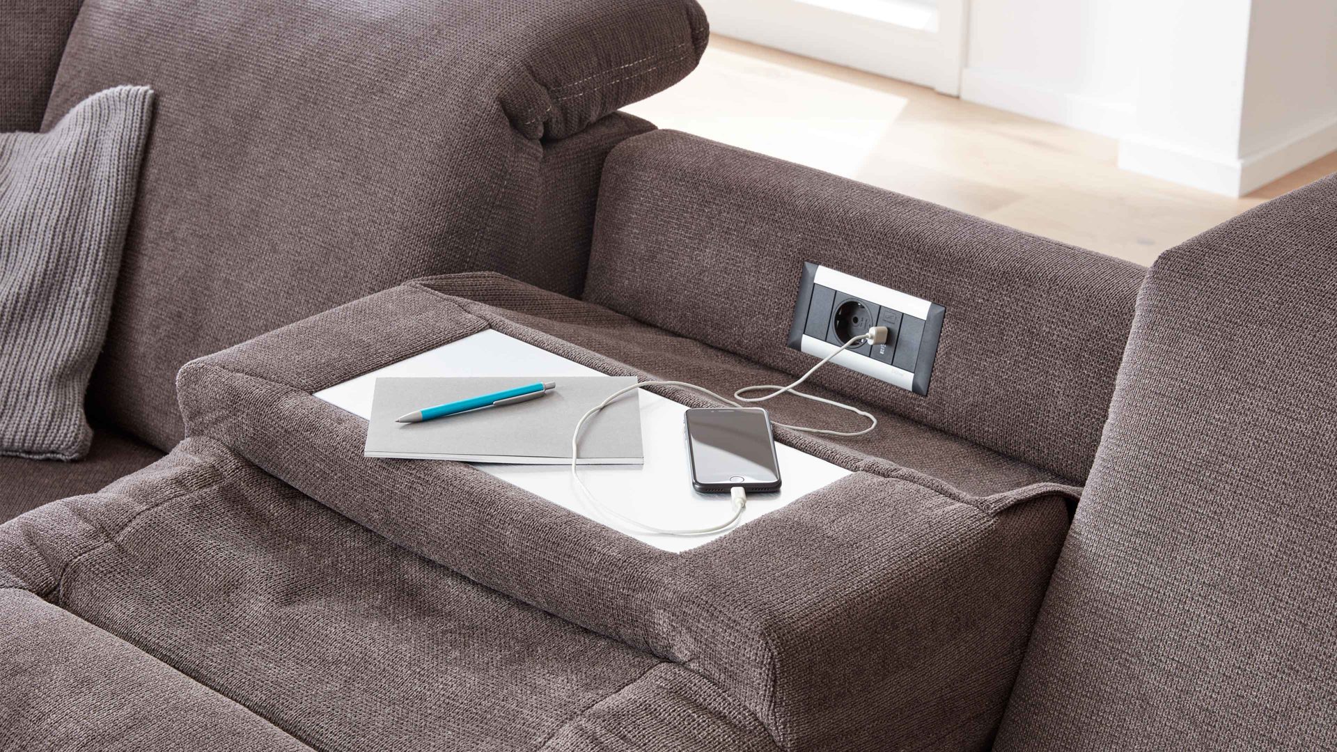 Besonders vorteilhaft sind die integrierte Steckdose und der USB-Anschluss. Diese Extras ermöglichen Ihnen beispielsweise das Aufladen Ihres Smartphones oder Notebooks, während Sie entspannt auf dem Sofa sitzend arbeiten oder relaxen. Die Farbe der Ablage entspricht stets der Fußfarbe des jeweiligen Möbels.