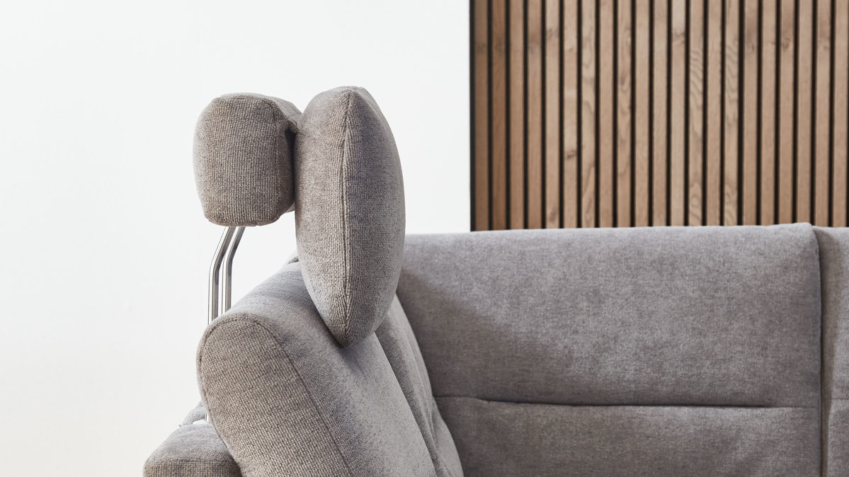 die Kopfstütze wird in die Kopfstützenvorrichtung an der Rückenlehne des Sofas eingesteckt und lässt sich dann in der Höhe und in der Neigung manuell verstellen