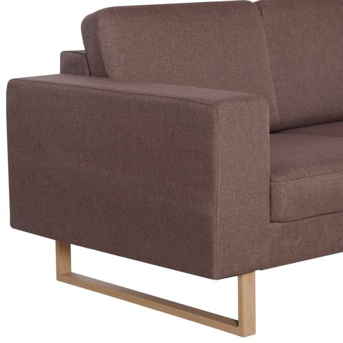 Dieses stilvolle 3-Sitzer-Sofa ist eine hervorragende Ergänzung zu Ihrem Wohnraum. Ob Sie nun eine gute, bequeme Couch für Ihre Geschäftsräume brauchen oder einfach nur nach einer stilvollen Bereicherung für Ihre Einrichtung suchen - dieses Stoffsofa ist eine hervorragende Wahl! Das Sofa verfügt über eine breite Sitzfläche und dick gepolsterte Kissen, die für höchsten Sitzkomfort sorgen. Es ist mit weichem Stoff bezogen, der auch strapazierfähig ist. Die Kissenbezüge lassen sich einfach sauber halten, da sie abnehmbar und maschinenwaschbar sind. Darüber hinaus trägt der starke Holzrahmen zur Stabilität der Konstruktion bei, während die Eisenbeine dem Sofa zusätzliche Langlebigkeit verleihen. Lieferung umfasst 1 x 3-Sitzer-Sofa, 3 x Rückenkissen und 3 x Sitzkissen. ** Farbe: Braun ** Material: Holzrahmen und Stoffpolsterung ** Bein Material: Eisen mit einer dekorativen Faux Holz Oberfläche ** Gesamtmaße: 200 x 82 x 75 cm (B x T x H) ** Sitzbreite: 165 cm ** Sitzpolsterstärke: 12 cm ** Rückenkissen-Dicke: 10 cm ** Sitzhöhe vom Boden (inkl. Sitzkissen): 40 cm ** Lieferung umfasst 1 x 3-Sitzer-Sofa, 3 x Rückenkissen und 3 x Sitzkissen ** Material: Polyester: 100% Maximal 110 kg pro Sitzplatz. Achte auf die Gefahr von offenem Feuer und anderen starken Wärmequellen in der Nähe des Produkts.