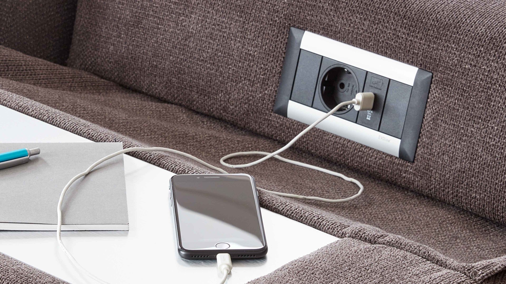 Besonders vorteilhaft sind die integrierte Steckdose und der USB-Anschluss. Diese Extras ermöglichen Ihnen beispielsweise das Aufladen Ihres Smartphones oder Notebooks, während Sie entspannt auf dem Sofa sitzend arbeiten oder relaxen. Die Farbe der Ablage entspricht stets der Fußfarbe des jeweiligen Möbels.
