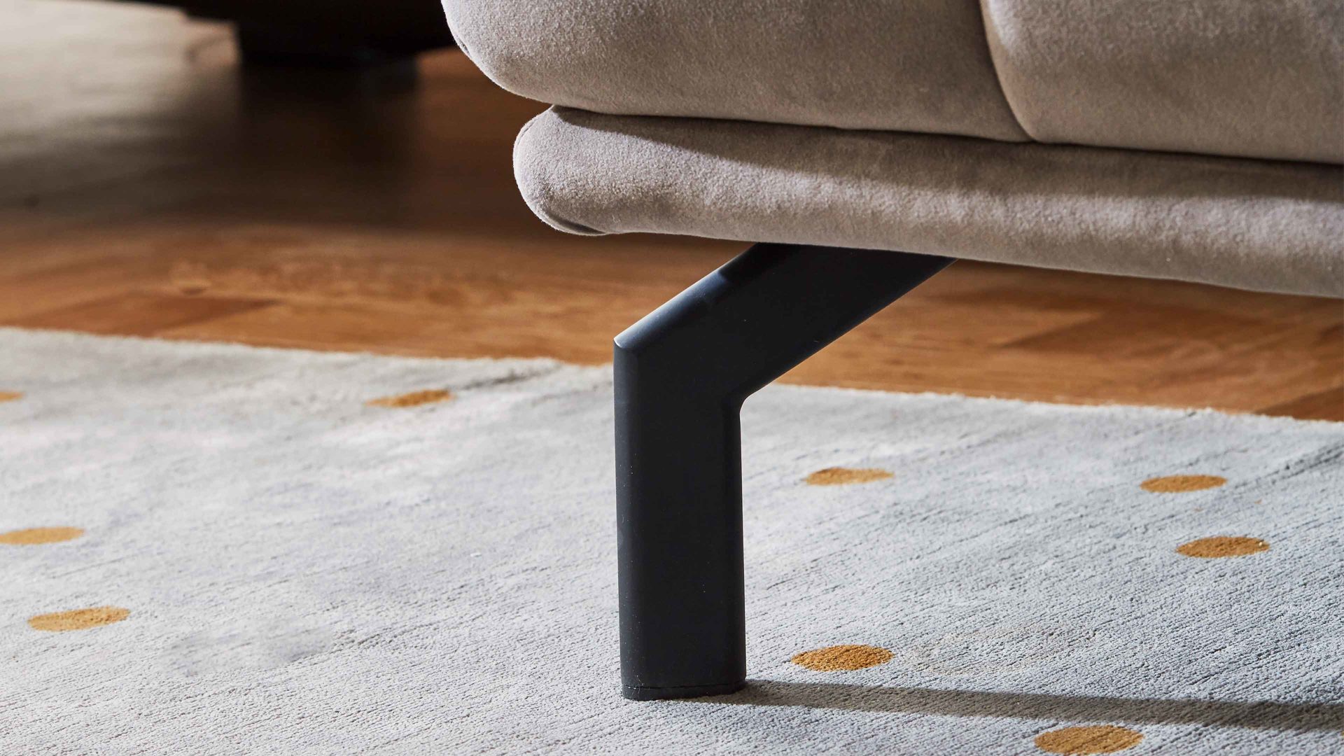 grauer Stoffbezug in Samtoptik und mattschwarze Metall-Winkelfüße