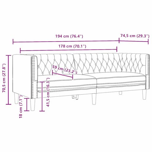 Das Chesterfield-Sofa für den Innenbereich kombiniert traditionellen Charme mit modernem Komfort und verleiht jedem Raum einen Hauch von klassischer Eleganz. Die tiefen Knöpfe und die gerollten Armlehnen schaffen eine gemütliche Atmosphäre – perfekt zum Kuscheln mit einem Buch oder für Besuche von Freunden. Mit seinem schlanken und strukturierten Design sorgt es für eine einladende Stimmung und ist eine beliebte Wahl für Wohnzimmer und Schlafzimmer. Als zentrales Element und gemütlicher Rückzugsort fügt dieses Sofa sich problemlos in verschiedene Einrichtungsstile ein und ist äußerst vielseitig. Kunstleder-Material: Das Sofa besteht aus hochwertigem Kunstleder, das schick aussieht und gleichzeitig langlebig ist. Es hält täglichem Verschleiß stand, sodass das Sofa auch nach längerer Nutzung gut aussieht. Zudem ist das Kunstleder weich, bequem und leicht zu reinigen. Vollständige Rückenstütze: Mit seinem schlanken Design bietet das Sofa volle Unterstützung und sieht in jedem Raum super aus. Die gerollten Armlehnen verleihen nicht nur dem stilvollen Aussehen zusätzlichen Charme, sondern bieten auch einen bequemen Platz für deine Arme. Strukturierter Komfort: Mit Schaumstofffüllung sorgt es für angenehmes Sitzen. Die Polsterung passt sich deinem Körper an und bietet optimale Unterstützung, egal ob du fernsiehst oder mit der Familie feierst. Das atmungsaktive Design fördert die Luftzirkulation und sorgt dafür, dass du warm bleibst. Funktionale Elemente: Die stabilen Beine aus robustem Kunststoff sorgen für starke Unterstützung, minimieren Bewegungen und bieten Stabilität, was das Sofa zur zuverlässigen Wahl für den Alltag macht. Mühelose Pflege: Die Reinigung ist super einfach – einfach mit einem feuchten Tuch abwischen. So bleibt das Sofa chic und sorgt dafür, dass es ein Hingucker in deinem Zuhause bleibt. ** Farbe: Schwarz ** Material: Kunstleder ** Gesamtabmessungen: 194 x 74.5 x 70.5 cm (L x B x H) ** Armlehnenhöhe vom sitz: 30 cm ** Sitzbereich: 59.5 x 178 cm (B x T) ** Sitzplatz: 3 ** Füllmaterial: Schaum ** Innen- / außenbereich: Nur für drinnen ** Lieferung: ** 1 x Chesterfield Sofa ** Anzahl der elemente: 1 ** Versammlung erforderlich: Ja