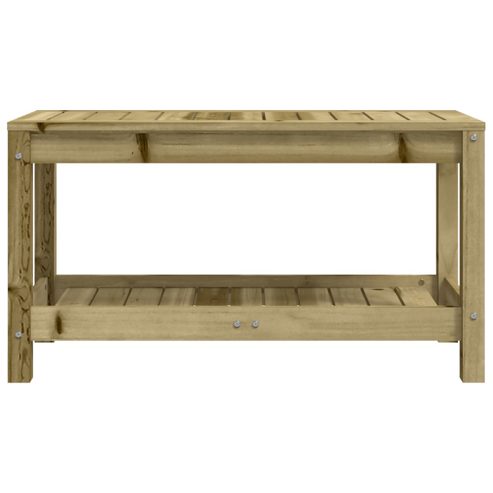 Diese Gartenbank aus Holz eignet sich perfekt für den Außenbereich und wird der Mittelpunkt deines Gartens, deiner Terrasse oder deines Innenhofs sein. Imprägniertes Holz: Massives Kiefernholz ist ein wunderschönes Naturmaterial. Kiefernholz weist eine gerade Maserung auf und die Aststellen verleihen dem Material seine charakteristische, rustikale Optik. Die Imprägnierung ist ein Konservierungsprozess, der unter Verwendung von Autoklaven durchgeführt wird. Die Druckbehandlung erhöht die Widerstandskraft gegen Verrottung und Witterung.Latten-Design: Das Latten-Design verhindert die Ansammlung von Wasser auf der Bank, hält die Sitzfläche trocken und verhindert Verrottung.Breite Anwendungen: Die Gartenbank eignet sich perfekt für jede Veranda, Terrasse, Hinterhof, Rasen, Garten, usw.Praktische Ablage: Diese Terrassenbank ist mit einer unteren Ablage versehen, die zusätzlichen Stauraum für verschiedene Sachen bietet. Gut zu wissen:Damit deine Gartenmöbel lange schön bleiben, empfehlen wir dir, sie mit einer wasserdichten Hülle zu schützen. ** Material: Kesseldruckimprägniertes Kiefernholz ** Abmessungen: 82,5 x 35 x 45 cm (B x T x H) ** Maximale Belastbarkeit: 110 kg ** Zusammenbau erforderlich: Ja ** Kissen inbegriffen: Nein Maximal 110 kg pro Sitzplatz.