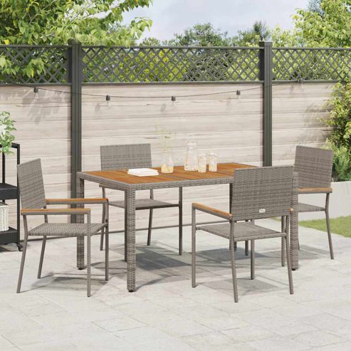 Die modernen Garten-Stapelstühle sind eine klasse Ergänzung für jeden Außenbereich, egal ob im Garten oder auf der Terrasse. Ihr schlankes Design sieht schick aus und sie sind super praktisch für Sitzgelegenheiten im Freien. Wenn du Gartenmöbel suchst, die sowohl funktional als auch stylish sind, heben diese Stühle dein Außenareal wirklich hervor – ob du eine Sommerparty feierst oder einfach nur einen ruhigen Moment genießt. Ihr ansprechender Stil passt perfekt zu verschiedenen Outdoor-Atmosphären. Starkes Rahmenmaterial: Diese Stühle sind aus hochwertigem Stahl gefertigt und haben eine solide Konstruktion, die viel Halt und Komfort bietet, während du im Garten oder auf der Terrasse entspannst. Stylische Holzarmlehnen: Die stabilen Armlehnen aus Akazienholz sorgen für eine schöne Deko und Komfort. Sie fördern eine entspannte Haltung und steigern das edle Gefühl des Stuhls. Platzsparende Funktion: Diese Stühle sind ideal, um Platz zu sparen, denn sie lassen sich einfach stapeln. Wenn du sie nicht benutzt, stapel sie einfach, um deinen Bereich ordentlich zu halten – perfekt für kleinere Gärten oder Terrassen. Wetterfeste Qualität: Diese Stühle sind so gemacht, dass sie UV-Strahlung standhalten und selbst bei Sonneneinstrahlung in gutem Zustand bleiben. Sie sehen auch an heißen Tagen toll aus. Pflegehinweise: Schütze deine Stühle, indem du sie abdeckst, wenn du sie nicht benutzt, und benutze einen Schraubendreher für den Zusammenbau. Mit etwas Pflege bleiben sie frisch und bereit für all deine Outdoor-Bedürfnisse. ** Farbe: Grau, braun ** Material: Pe rattan, massives akazienholz ** Gesamtabmessungen: 54 x 56 x 90 cm (L x B x H) ** Sitztiefe: 49.0 cm ** Maximales gewicht: 111 kg ** Sitzplatz: 4 ** Versammlung erforderlich: Ja ** Lieferung: ** 4 x Gartenstuhl