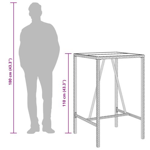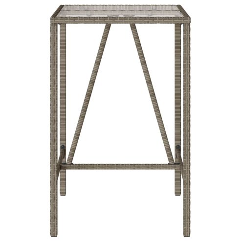 Dieser trendige Outdoor-Bartisch vereint Stil und Funktionalität und wird ein echter Hingucker in deinem Garten, auf deiner Terrasse oder in jedem anderen Außenbereich sein. Langlebiges Material: PE-Rattan, auch als Poly Rattan bekannt, ist ein robustes, pflegeleichtes synthetisches Material, das die Optik von natürlichem Rattan aufweist. Es kennzeichnet sich durch ein geringes Eigengewicht und lässt sich einfach reinigen. Aufgrund seiner Haltbarkeit und Witterungsbeständigkeit wird es häufig bei der Herstellung von Gartenmöbeln verwendet.Tischplatte aus Glas: Die Tischplatte des Gartentisches besteht aus starkem und langlebigem Hartglas, sodass sie leicht mit einem feuchten Tuch gereinigt werden kann und deinem Außenbereich einen Hauch von Eleganz verleiht.Robuster und stabiler Rahmen: Dank des pulverbeschichteten Stahlrahmens ist das Möbelstück robust, stabil und für den täglichen Einsatz im Außenbereich geeignet.Breite Anwendung: Mit seinem markanten Design schafft der Garten-Bartisch eine angenehme Atmosphäre und fügt sich harmonisch in jede Umgebung ein. Gut zu wissen:Wir empfehlen dir, deine Gartenmöbel mit einer wasserdichten Hülle zu schützen, um lange Zeit eine ansprechende Optik aufzuweisen. ** Rattan-Farbe: Grau ** Farbe der Glasplatte: Schwarz ** Material: PE-Rattan, pulverbeschichteter Stahl, Hartglas ** Abmessungen: 70 x 70 x 110 cm (L x B x H) ** Glasstärke: 4 mm ** Zusammenbau erforderlich: Ja