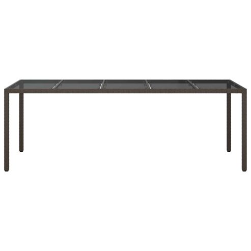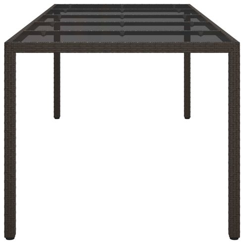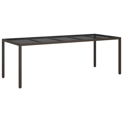 Verpass deinem Außenbereich einen neuen Look mit diesem Gartentisch, der perfekt für Gartenpartys und Essen auf der Terrasse ist. Sein modernes rechteckiges Design und der klare Stil passen richtig gut zu verschiedenen Außen-Dekoren und bieten eine schicke und praktische Grundlage für das Essen im Freien. Er ist einfach und funktional, ideal für alle, die nach einer eleganten Essenslösung im Freien suchen. Robuste Bauweise: Hergestellt aus strapazierfähigem Poly-Rattan, stabilem Stahl und Sicherheitsglas. Diese hochwertigen Materialien sind wetterfest und machen diesen Tisch zu einer zuverlässigen Ergänzung für jedes Jahr. Elegantes Aussehen: Die große rechteckige Tischplatte bietet genug Platz für Mahlzeiten mit Familie und Freunden. Seine glatte Oberfläche sorgt für einen modernen Touch. Wetterfeste Eigenschaften: Dank seiner wasser- und UV-beständigen Natur hält der Tisch sowohl Regen als auch Sonne stand und bleibt schön. Funktionale Bauweise: Hat einen starken, pulverbeschichteten Stahlrahmen für extra Haltbarkeit. Die stabilen Beine sorgen für Standfestigkeit und unterstützen den modernen Stil. Einfache Pflege: Super einfach zu pflegen, einfach mit einem feuchten Tuch abwischen und aggressive Reiniger vermeiden. Eine Abdeckung ist am besten, wenn er nicht in Gebrauch ist. ** Farbe: Braun ** Material: Poly rattan ** Beenden: Pulverbeschichtet ** Gesamtabmessungen: 250 x 100 x 75 cm (L x B x H) ** Langlebig ** Wasserfeste Materialien ** Versammlung erforderlich: Ja ** Lieferung: ** 1 x Gartentisch
