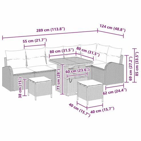 Dieses Garten-Sofa-Set ist eine coole Mischung aus Gemütlichkeit und Praktikabilität. Es verwandelt deinen Außenbereich in eine moderne Wohlfühloase. Aus Poly-Rattan und einem schicken pulverbeschichteten Stahlrahmen gefertigt, bringt es einen smarten Look, der in jeden modernen Raum passt. Die bequemen, mit Schaumstoff gefüllten Polyesterkissen laden zum Entspannen ein und sind perfekt zum Chillen, für gesellige Runden oder ein Dinner im Freien. Ideal für Gärten oder Terrassen, bringen die warmen Brauntöne eine freundliche Atmosphäre und lassen deinen Außenbereich wie ein Zuhause fern von Zuhause wirken. Poly-Rattan-Material: Dieses Garten-Sofa-Set besteht aus hochwertigem Poly-Rattan, das super langlebig und robust gegen Sonnenstrahlen ist. Das geflochtene Design gibt deinem Außenbereich einen schicken Look. Egal ob Frühling oder Sommer, Poly-Rattan behält die Form und sieht das ganze Jahr gut aus. Pulverbeschichteter Stahlrahmen: Der Rahmen aus pulverbeschichtetem Stahl ist stabil und rostfrei. Diese Beschichtung macht es langlebig und ideal für den Außeneinsatz. Die matte Oberfläche verleiht ihm eine elegante Note, die gut in moderne Umgebungen passt. Massivholz-Akazienoberfläche: Die Oberfläche aus massivem Akazienholz ist stabil und sieht super aus. Das gibt dem Set einen natürlichen Charme und eine sichere Fläche für Essen oder Brettspiele. Außerdem ist das Holz von Natur aus wetterbeständig, perfekt für Gartenmöbel. Funktionaler Stauraum: Mit praktischen Fächern bietet dir dieses Sofa-Set Platz für deine Outdoor-Utensilien. Es ist praktisch und hilft, deinen Außenbereich ordentlich zu halten. Du kannst Kissen und andere Dinge verstauen, ohne auf Style verzichten zu müssen. Pflegeanleitung: Um das Set in gutem Zustand zu halten, nutze Schutzabdeckungen, wenn es nicht in Benutzung ist. Deine Möbel vor Witterungseinflüssen zu schützen, ist der Schlüssel, damit sie lange halten, und du deine Outdoor-Momente genießen kannst. ** Farbe: Beige und hellgrau ** Material: Poly-rattan und stahl und massivholz akazie ** Beenden: Matt ** Gesamtabmessungen: 80 x 80 x 71 cm (L x B x H) ** Gewicht: 66.8 kg ** Armlehnenhöhe vom sitz: 55 cm ** Sitzbereich: 55 x 55 cm (B x T) ** Sitzplatz: 8 ** Füllmaterial: Schaum ** Innen- / außenbereich: Nur für draußen ** Lieferung: ** 2 x Armlehnen-Sofa mit Stauraumfunktion und wasserfestem Sack, 1 x Ecksofa mit Stauraumfunktion und wasserfestem Sack, 3 x Sitzfläche mit Stauraumfunktion und wasserfestem Sack, 2 x Quadratischen Hocker, 1 x Tisch ** Anzahl der elemente: 9 ** Versammlung erforderlich: Ja