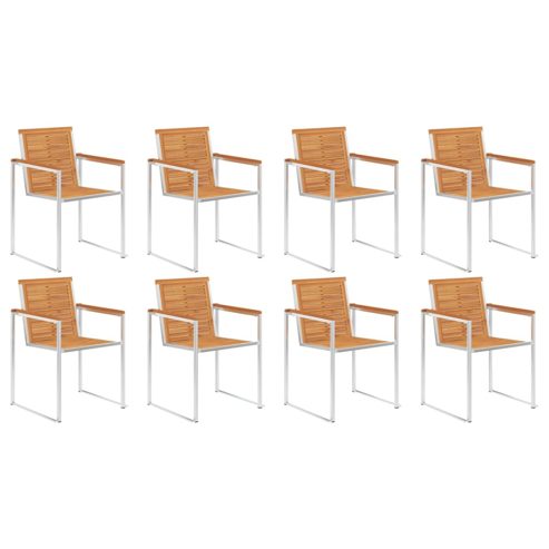 Diese Holz-Gartenstühle werden zum Mittelpunkt Ihres Gartens oder Ihrer Terrasse. Die Essstühle sind aus massivem Akazienholz und hochwertigem Edelstahl gefertigt, wodurch sie sehr langlebig, rostfrei, robust und leicht mit einem feuchten Tuch zu reinigen sind. Das mitgelieferte Kissen ist mehr als eine praktische Ergänzung; es hat auch eine dekorative Funktion. Genießen Sie ein schönes Abendessen im Freien oder entspannen Sie einfach mit diesem klassischen Gartenstuhl-Set. Hinweis: Um die Lebensdauer Ihrer Gartenmöbel zu verlängern, empfehlen wir Ihnen, diese regelmäßig zu reinigen und bei Nichtgebrauch im Freien abzudecken.Reinigung: Verwenden Sie eine milde Seifenlösung.Lagerung: Wenn möglich, an einem kühlen, trockenen Ort im Innenbereich lagern. Wenn das Produkt im Freien gelagert wird, schützen Sie es mit einer wasserdichten Abdeckung. Wischen und trocknen Sie das überschüssige Wasser oder den Schnee nach Regen oder Schneefall von der ebenen Fläche. Sorgen Sie für eine ausreichende Luftzirkulation, um feuchtigkeitsbedingte Schäden zu vermeiden. ** Kissenfarbe: Cremeweiß ** Material: Massives Akazienholz mit Ölfinish in Teak-Optik, Edelstahl 304 ** Kissenmaterial: Stoff (100% Polyester) ** Maße: 60 x 56 x 85 cm (B x T x H) ** Sitztiefe: 46 cm ** Sitzhöhe: 45 cm ** Armlehnenhöhe vom Boden: 65,5 cm ** Polsterstärke: 7 cm ** Stapelbar ** Wetter- und rostbeständig ** Zusammenbau erforderlich: Ja ** Lieferung enthält: ** 8 x Stühle ** 8 x Kissen