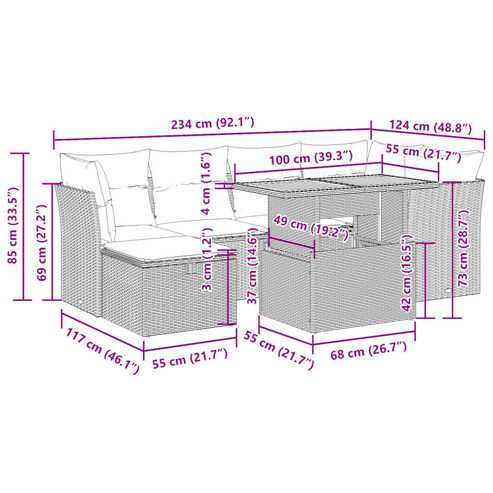 Diese Garten-Sofagarnitur ist die perfekte Ergänzung zu deinem Garten, deiner Terrasse oder deinem Innenhof. Sie bietet einen bequemen und einladenden Platz, um mit Familie und Freunden zu plaudern oder dich einfach nur zu entspannen und das Leben im Freien zu genießen.Langlebiges Material: PE-Rattan, auch als Poly Rattan bekannt, ist ein robustes, pflegeleichtes synthetisches Material, das die Optik von natürlichem Rattan aufweist. Es kennzeichnet sich durch ein geringes Eigengewicht und lässt sich einfach reinigen. Aufgrund seiner Haltbarkeit und Witterungsbeständigkeit wird es häufig bei der Herstellung von Gartenmöbeln verwendet.Stauraum mit wasserfestem Beutel: Jedes Gartensofa verfügt über ein Staufach unter der Sitzfläche, das mit einem wasserfesten Beutel zur Aufbewahrung von Kissen, Spielzeug und anderen Gegenständen versehen ist. Die Kissen sind mit Bezügen versehen und lassen sich mit Klettverschlüssen fest und sicher an den Sofas befestigen.Abnehmbarer und waschbarer Bezug: Diese Sitzkissen verfügen über abnehmbare Bezüge für einfaches Waschen und Pflegen.Modulares Design: Dank des modularen Designs lassen sich die Gartenmöbel völlig flexibel und einfach umstellen, um deinen Außenbereich ganz individuell zu gestalten.Gut zu wissen:Wir empfehlen dir, deine Gartenmöbel mit einer wasserdichten Hülle zu schützen, um lange Zeit eine ansprechende Optik aufzuweisen. ** Maximale Tragfähigkeit (pro Sitz ): 110 kg ** UV-beständig ** Verstellbare Füße aus Kunststoff ** Zusammenbau erforderlich: Ja ** Mittelsofa: ** Farbe: Schwarz ** Material: PE-Rattan, pulverbeschichteter Stahl ** Abmessungen: 55 x 62 x 69 cm (B x T x H) ** Sitzgröße: 55 x 55 cm (B x T) ** Sitzhöhe vom Boden (ohne Kissen): 37 cm ** Abmessungen des wasserfesten Beutels: 55 x 53 x 34 cm (L x B x H) ** Ecksofa: ** Farbe: Schwarz ** Material: PE-Rattan, pulverbeschichteter Stahl ** Abmessungen: 62 x 62 x 69 cm (B x T x H) ** Sitzgröße: 55 x 55 cm (B x T) ** Sitzhöhe vom Boden (ohne Kissen): 37 cm ** Abmessungen des wasserfesten Beutels: 55 x 53 x 34 cm (L x B x H) ** Ecksofa: ** Farbe: Schwarz ** Material: PE-Rattan, pulverbeschichteter Stahl ** Abmessungen: 62 x 62 x 69 cm (B x T x H) ** Sitzgröße: 55 x 55 cm (B x T) ** Sitzhöhe vom Boden (ohne Kissen): 37 cm ** Hocker: ** Farbe: Schwarz ** Material: PE-Rattan, pulverbeschichteter Stahl ** Abmessungen: 55 x 55 x 37 cm (B x T x H) ** Tisch: ** Farbe: Schwarz ** Material: PE-Rattan, pulverbeschichteter Stahl, massives Akazienholz mit Ölfinish ** Abmessungen: 100 x 55 x 44/73 cm (L x B x H) ** Kissen: ** Farbe: Rot ** Bezugsmaterial: Stoff (100% Polyester) ** Füllmaterial des Sitzkissen: Schaumstoff ** Füllmaterial des Rückenkissens: Baumwollfaser ** Abmessungen des Sitzkissens: 55 x 55 x 3 cm (B x T x H) ** Abmessungen des Rückenkissens: 55 x 45 x 13 cm (L x B x T) ** Lieferung umfasst: ** 1 x Gartentisch ** 3 x Ecksofa mit Stauraum und wasserfestem Beutel ** 2 x Mittelsofa mit Stauraum und wasserfestem Beutel ** 1 x Hocker mit Stauraum und wasserfestem Beutel ** 6 x Sitzkissen mit abnehmbarem und waschbarem Bezug ** 8 x Rückenkissen