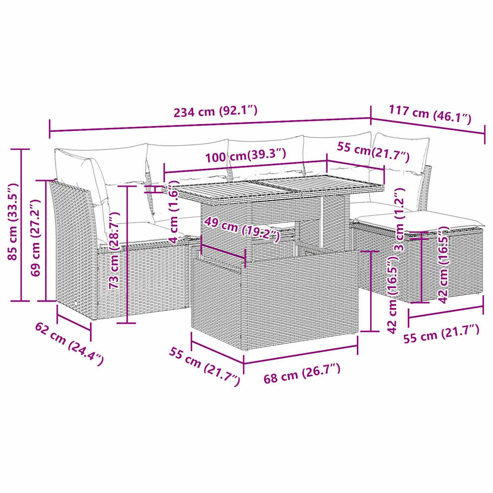 Diese Garten-Sofagarnitur ist die perfekte Ergänzung zu deinem Garten, deiner Terrasse oder deinem Innenhof. Sie bietet einen bequemen und einladenden Platz, um mit Familie und Freunden zu plaudern oder dich einfach nur zu entspannen und das Leben im Freien zu genießen. Langlebiges Material: PE-Rattan, auch als Poly Rattan bekannt, ist ein robustes, pflegeleichtes synthetisches Material, das die Optik von natürlichem Rattan aufweist. Es kennzeichnet sich durch ein geringes Eigengewicht und lässt sich einfach reinigen. Aufgrund seiner Haltbarkeit und Witterungsbeständigkeit wird es häufig bei der Herstellung von Gartenmöbeln verwendet.Stauraum mit wasserfestem Beutel: Jedes Gartensofa verfügt über ein Staufach unter der Sitzfläche, das mit einem wasserfesten Beutel zur Aufbewahrung von Kissen, Spielzeug und anderen Gegenständen versehen ist. Die Kissen sind mit Bezügen versehen und lassen sich mit Klettverschlüssen fest und sicher am Sofa befestigen.Verstellbare Tischplatte: Die Tischplatte lässt sich anheben, um den Gartentisch höher zu machen und ihn von einem Couchtisch in einen Esstisch zu verwandeln. Er eignet sich daher perfekt für Gäste oder Mahlzeiten im Freien.Vielseitiger Fußhocker: Der Hocker ist vielseitig einsetzbar und dient als bequeme Fußstütze beim Entspannen auf dem Sofa oder als zusätzlicher Sitzplatz in deinem Garten.Abnehmbarer und waschbarer Bezug: Diese Sitzkissen verfügen über abnehmbare Bezüge für einfaches Waschen und Pflegen.Robustes und stabiles Gestell: Der pulverbeschichtete Stahlgestell ist stark, stabil, langlebig sowie korrosions- und wetterbeständig, um eine lang anhaltende Leistung zu gewährleisten. Gut zu wissen:Wir empfehlen dir, deine Gartenmöbel mit einer wasserdichten Hülle zu schützen, um lange Zeit eine ansprechende Optik aufzuweisen. ** Abmessungen des wasserfesten Beutels: 55 x 53 x 34 cm (L x B x H) ** Maximale Tragfähigkeit (pro Sitz): 110 kg ** UV-beständig ** Verstellbare Füße aus Kunststoff ** Zusammenbau erforderlich: Ja ** Mittelsofa: ** Farbe: Schwarz ** Material: PE-Rattan, pulverbeschichteter Stahl ** Abmessungen: 55 x 62 x 69 cm (B x T x H) ** Sitzgröße: 55 x 55 cm (B x T) ** Sitzhöhe vom Boden (ohne Kissen): 37 cm ** Ecksofa: ** Farbe: Schwarz ** Material: PE-Rattan, pulverbeschichteter Stahl ** Abmessungen: 62 x 62 x 69 cm (B x T x H) ** Sitzgröße: 55 x 55 cm (B x T) ** Sitzhöhe vom Boden (ohne Kissen): 37 cm ** Tisch: ** Farbe: Schwarz ** Material: PE-Rattan, pulverbeschichteter Stahl, massives Akazienholz mit Ölfinish ** Abmessungen: 100 x 55 x 44/73 cm (L x B x H) ** Fußhocker: ** Farbe: Schwarz ** Material: PE-Rattan, pulverbeschichteter Stahl ** Abmessungen: 55 x 55 x 37 cm (B x T x H) ** Abmessungen des wasserfesten Beutels: 55 x 53 x 34 cm (L x B x H) ** Kissen: ** Farbe: Blau ** Bezugsmaterial: Stoff (100% Polyester) ** Füllmaterial des Sitzkissen: Schaumstoff ** Füllmaterial des Rückenkissens: Baumwollfaser ** Abmessungen des Sitzkissens: 55 x 55 x 3 cm (B x T x H) ** Abmessungen des Rückenkissens: 55 x 45 x 13 cm (L x B x T) ** Lieferung umfasst: ** 2 x Mittelsofa mit Stauraum und wasserfestem Beutel ** 2 x Ecksofa mit Stauraum und wasserfestem Beutel ** 1 x Tisch ** 1 x Fußhocker mit Stauraum und wasserfestem Beutel ** 6 x Rückenkissen ** 5 x Sitzkissen mit abnehmbarem und waschbarem Bezug