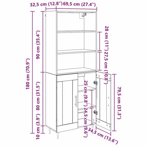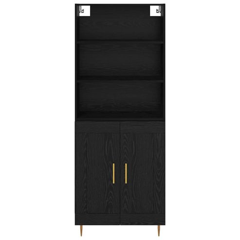Dieses moderne Highboard ist die perfekte Lösung für zusätzlichen Stauraum im Wohnzimmer. Mit seiner schlanken, rechteckigen Form vermittelt es zeitgenössische Eleganz und ist ideal für urbane Wohnungen, wo Stil und Funktionalität Hand in Hand gehen. Die klaren Linien und das minimalistische Design ergänzen viele Einrichtungsstile und bieten ein frisches, unaufdringliches Erscheinungsbild. An der Wand montiert, nutzt es den vertikalen Raum optimal, sodass der Bodenplatz frei bleibt. Diese vielseitige Möglichkeit zur Aufbewahrung passt zu jedem, der Praktikabilität und Ästhetik in sein Zuhause bringen möchte. Materialien: Dieses Highboard aus Holzwerkstoff ist langlebig und widerstandsfähig und erfüllt beide Anforderungen an Funktionalität und Optik. Die robuste Struktur ist alltagstauglich und die tolle Oberflächenbehandlung bleibt dauerhaft schön. Die Holzwerkstoff-Konstruktion ist außerdem nachhaltig und sorgt für stilvolle Ergebnisse in verschiedenen Wohnbereichen. Enthaltene Komponenten: Das Highboard kommt mit einem Sideboard, das eine praktische Oberseite für zusätzlichen Stauraum hat. Die Tür mit Scharnieren ermöglicht einfachen Zugang zu den Fächern und sorgt dafür, dass alles ordentlich bleibt. Die konischen Metallbeine geben nicht nur Halt, sondern sehen auch toll aus und passen perfekt zum modernen Design. Diese Komponenten sorgen insgesamt für Praktikabilität und eine ansprechende Optik. Merkmale/Funktion/Design: Das Hauptmerkmal dieses Möbelstücks ist das clevere Wandmontage-Design, das Platz spart. Seine Vielseitigkeit macht es für verschiedene Raumkonfigurationen geeignet. Der unkomplizierte Stil fügt sich gut in moderne Interieurs ein und ermöglicht es, je nach Vorlieben zu variieren. Ein raffinierter Ansatz, der hilft, den Boden frei zu halten. Empfohlene Verwendung: Dieses Highboard geht über einfache Aufbewahrung hinaus und eignet sich für Wohnzimmer, Home-Offices oder schicke Essbereiche. Das schlichte, modische Design spricht trendbewusste Hausbesitzer an, die Ordnung in ihrem Zuhause wünschend. Jedes Element erfüllt einen Zweck und trägt zu einem aufgeräumten Wohnumfeld bei. Pflege & Wartung: Um die Funktionalität und das schöne Aussehen des Highboards zu sichern, baue es gemäß den Anweisungen des Herstellers auf – du brauchst einen Schraubendreher und eine helfende Hand. Reinige die Oberfläche regelmäßig mit einem feuchten Tuch und lass aggressive Chemikalien weg, die das Finish schädigen könnten. Regelmäßige Checks tragen dazu bei, die Qualität des Holzwerkstoffs zu erhalten und sorgen dafür, dass das Highboard lange Freude bereitet. ** Farbe: Schwarz Eichen-Optik ** Material: Holzwerkstoff ** Gesamtabmessungen: 69,5 x 34 x 180 cm (L x B x H) ** With drawer ** mit 2 Türen ** Montage erforderlich: Ja ** Lieferumfang: ** 1 x Sideboard ** 1 x Oberteil fürs Hochboard