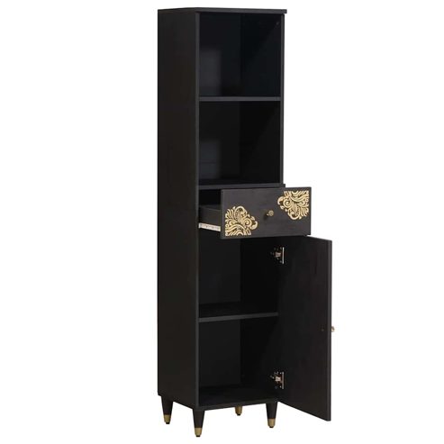 Dieser moderne Badezimmer-Sideboard verwandelt jedes Wohnzimmer und bringt Eleganz mit seinem schlanken Design. Speziell für moderne Räume gestaltet, bietet die rechteckige Form visuelles Interesse und passt perfekt in minimalistische Interieurs, während er reichlich Stauraum für alltägliche Dinge und Deko bietet. Vielseitig und schön, ist er ideal für Bereiche, die sowohl Stil als auch Platzoptimierung brauchen. Hochwertige Materialien: Aus massivem Mangoholz und Holzwerkstoffen hergestellt, verbindet dieser Sideboard Langlebigkeit mit ansprechendem Design. Das Mangoholz bringt durch seine dichte Maserung Eleganz und einzigartige Muster. Die Holzwerkstoffe bieten strukturelle Stärke, die dafür sorgt, dass der Sideboard lange schön bleibt. Zusammen sind diese Materialien ein stabiles Stück, das in jedem Raum Eindruck macht. Elegantes Design: Der Sideboard hat ein beeindruckendes goldenes Druckdesign, das einen glamourösen Akzent setzt und die visuelle Anziehung verstärkt. Das filigrane Muster bringt Luxus in den Alltag und verwandelt ein praktisches Möbelstück in ein Kunstwerk, das Blicke anzieht. Ob im Wohnzimmer oder Schlafzimmer, sein Design strahlt Opulenz und Stil aus. Robuste Komponenten: Ausgestattet mit stilvollen Messingknöpfen und -füßen, bietet der Sideboard Stabilität und Nutzerfreundlichkeit. Das Messing bringt nicht nur einen Hauch von Luxus, sondern verbessert auch die Funktionalität des Möbels. Die zylindrischen Füße sorgen für starken Halt und garantieren Stabilität, selbst wenn verschiedene Gegenstände draufstehen. Funktionale Türen: Mit glatten, bündigen Türen ermöglicht der Sideboard einfachen Zugriff auf die gelagerten Sachen und bleibt dabei ein schöner Anblick, der moderne Stile ergänzt. Die klaren Linien und die Schlichtheit der Türen heben das anspruchsvolle Design hervor und machen ihn zu einem flexiblen Möbelstück für jeden Raum. Pflege & Wartung: Um seinen hochwertigen Look zu erhalten, regelmäßig mit einem trockenen Tuch abwischen. Diese einfache Pflege sorgt für langanhaltenden Glanz und hält das Möbelstück über Jahre frisch - eine mühelose Ergänzung für jedes moderne Zuhause. ** Farbe: Schwarz ** Material: Massivholz Mango ** Gesamtabmessungen: 38 x 33 x 160 cm (L x B x H) ** Mit Schublade ** mit 1 Flächenbündige Tür Tür ** Montage erforderlich: Ja ** Lieferumfang: ** 1 x Sideboard