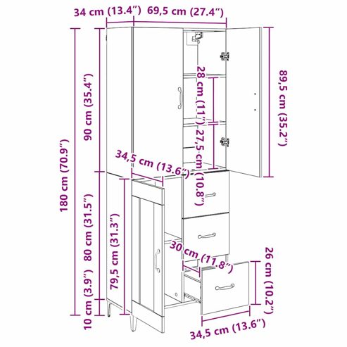 Dieses moderne Highboard bietet schlankes und funktionales Design mit einer zeitgemäßen Ästhetik, ideal für verschiedene Innenräume wie Wohnzimmer. Dank seiner klaren Linien und dem minimalistischen Stil nutzt der wandmontierte Schrank den Raum optimal und verleiht deinem Zuhause gleichzeitig einen Hauch von Eleganz. Es hat eine rechteckige Form und eine durchdachte Konstruktion, was es zur perfekten Wahl für alle macht, die Wert auf Stil und Funktion legen und vielseitigen Stauraum mit modernem Flair suchen. Konstruktion aus Holzwerkstoff Dieses Highboard hat eine stabile Konstruktion aus Holzwerkstoff, die hitzebeständig ist. So kannst du dich entspannen, während temperaturempfindliche Gegenstände verstaut werden. Das Material sorgt dafür, dass es langlebig ist und länger schön aussieht, auch bei regelmäßigem Gebrauch. Viel Platz für alles Mit mehreren Fächern hilft dir dieses Highboard, den Überblick zu behalten. Es fördert Ordnung und schnelles Zugreifen auf deine Sachen. Das Design eignet sich hervorragend zur Aufbewahrung von Büchern bis hin zu Deko-Elementen. Wandmontage spart Platz Als wandmontiertes Möbelstück schafft dieses Highboard wertvollen Platz auf dem Boden. Es sorgt für eine luftige und großzügige Raumwirkung, während es gleichzeitig praktischen Stauraum bietet. Perfekt für Räume, in denen du Platz sparen musst. Moderne Anziehungskraft Mit seinen schlanken, verjüngenden Metallbeinen und einer einheitlichen Farbpalette hat das Highboard einen modernen Look, der perfekt für zeitgenössische Innenräume ist. Es ist eine auffällige, aber dezente Ergänzung für jede Einrichtung, sei es minimalistisch oder komplex. Einfache Montage Dank der beiliegenden Anleitung benötigt die Montage nur zwei Personen und einen Schraubenzieher für die Einrichtung. Dieser einfache Prozess sorgt für eine sichere Installation und betont die Stabilität und Langlebigkeit des Möbelstücks im Gebrauch. ** Farbe: Altholz ** Material: Holzwerkstoff ** Gesamtabmessungen: 69,5 x 34 x 180 cm (L x B x H) ** Mit Schublade ** mit 2 Türen ** Montage erforderlich: Ja ** Lieferumfang: ** 1 x Sideboard: 69,5 x 34 x 90 cm ** 1 x Oberteil für Hochboard: 69,5 x 34 x 90 cm