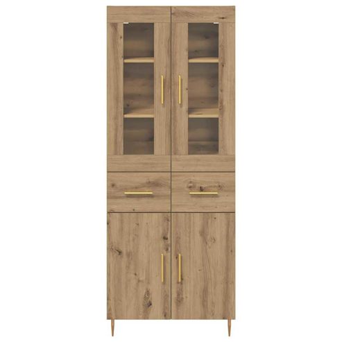 Dieses wandmontierte Highboard ist ein echter Hingucker in jedem modernen Wohnzimmer. Es bietet Funktionalität, ohne auf Stil zu verzichten. Es passt super in moderne Atmosphären, hat klare Linien und ein elegantes Aussehen. Egal, ob du als Profi einen praktischen Stauraum brauchst oder als Familie ein minimalistisches Gefühl willst, das Design ist für jeden passend. Die rechteckige Form und die schicken goldenen Details halten es schlicht, aber klassisch und zeigen tolle Handwerkskunst. Materialien: Hergestellt aus Holzwerkstoff, bietet dieser Highboard ein stabiles und langlebiges Fundament. Das Glas sorgt für einen eleganten Look und macht es einfach, an den Inhalt zu kommen. Diese Materialien vereinen sich, um ein starkes und schönes Möbelstück zu schaffen, das dir bei all deinen Storage-Bedürfnissen zur Seite steht. Inklusive Komponenten: Er kommt mit Glastüren für eine klare Sicht und minimalistischen goldenen Griffen, die dem Ganzen einen sauberen Look verleihen. Die kegelförmigen goldenen Beine sehen nicht nur gut aus, sie sorgen auch für Stabilität und betonen die schlanke Höhe. Funktionen / Funktion / Design: Er hat spezielle Stauraumflächen mit Fächern und Regalen, um all deine Lagerbedürfnisse zu erfüllen. Die matte Oberfläche gibt ihm ein dezentes, flaches Design, das perfekt zu jedem Wohnraum passt, ohne die Deko zu überladen. Empfohlene Verwendungen: Dieser Highboard eignet sich super für Wohnzimmer und ist ideal, um geschätzte Sammlerstücke oder tägliche Essentials zu verstauen. Sein hohes, schlankes Design nutzt den vertikalen Raum perfekt aus, ideal für kompakte Stadtwohnungen und geräumige Familienhäuser. Pflege & Wartung: Du brauchst zwei Personen und einen Schraubendreher, um ihn zusammenzubauen. Folge einfach den Anweisungen des Herstellers für eine einfache Montage. Wische ihn sanft mit einem weichen Tuch ab, um die Oberflächen in Schuss zu halten, und benutze Glasreiniger, damit die Türen glänzen. ** Farbe: Artisan-Eiche ** Material: Holzwerkstoff ** Gesamtabmessungen: 69,5 x 34 x 180 cm (L x B x H) ** mit 2 Schubladen ** mit 4 Glastüren ** Stauraum ** Montage erforderlich: Ja ** Lieferumfang: ** 2 x Sideboard