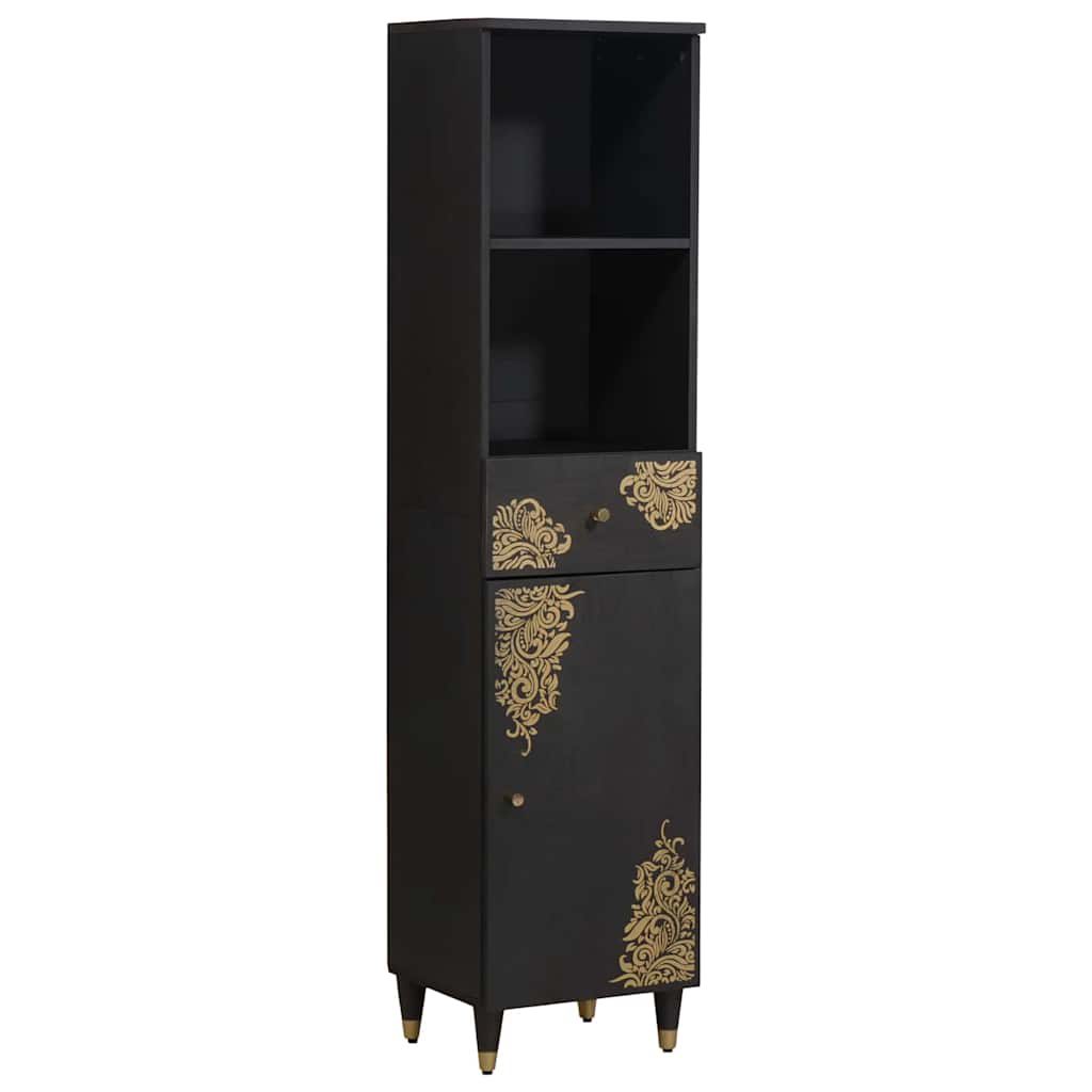 Dieser moderne Badezimmer-Sideboard verwandelt jedes Wohnzimmer und bringt Eleganz mit seinem schlanken Design. Speziell für moderne Räume gestaltet, bietet die rechteckige Form visuelles Interesse und passt perfekt in minimalistische Interieurs, während er reichlich Stauraum für alltägliche Dinge und Deko bietet. Vielseitig und schön, ist er ideal für Bereiche, die sowohl Stil als auch Platzoptimierung brauchen. Hochwertige Materialien: Aus massivem Mangoholz und Holzwerkstoffen hergestellt, verbindet dieser Sideboard Langlebigkeit mit ansprechendem Design. Das Mangoholz bringt durch seine dichte Maserung Eleganz und einzigartige Muster. Die Holzwerkstoffe bieten strukturelle Stärke, die dafür sorgt, dass der Sideboard lange schön bleibt. Zusammen sind diese Materialien ein stabiles Stück, das in jedem Raum Eindruck macht. Elegantes Design: Der Sideboard hat ein beeindruckendes goldenes Druckdesign, das einen glamourösen Akzent setzt und die visuelle Anziehung verstärkt. Das filigrane Muster bringt Luxus in den Alltag und verwandelt ein praktisches Möbelstück in ein Kunstwerk, das Blicke anzieht. Ob im Wohnzimmer oder Schlafzimmer, sein Design strahlt Opulenz und Stil aus. Robuste Komponenten: Ausgestattet mit stilvollen Messingknöpfen und -füßen, bietet der Sideboard Stabilität und Nutzerfreundlichkeit. Das Messing bringt nicht nur einen Hauch von Luxus, sondern verbessert auch die Funktionalität des Möbels. Die zylindrischen Füße sorgen für starken Halt und garantieren Stabilität, selbst wenn verschiedene Gegenstände draufstehen. Funktionale Türen: Mit glatten, bündigen Türen ermöglicht der Sideboard einfachen Zugriff auf die gelagerten Sachen und bleibt dabei ein schöner Anblick, der moderne Stile ergänzt. Die klaren Linien und die Schlichtheit der Türen heben das anspruchsvolle Design hervor und machen ihn zu einem flexiblen Möbelstück für jeden Raum. Pflege & Wartung: Um seinen hochwertigen Look zu erhalten, regelmäßig mit einem trockenen Tuch abwischen. Diese einfache Pflege sorgt für langanhaltenden Glanz und hält das Möbelstück über Jahre frisch - eine mühelose Ergänzung für jedes moderne Zuhause. ** Farbe: Schwarz ** Material: Massivholz Mango ** Gesamtabmessungen: 38 x 33 x 160 cm (L x B x H) ** Mit Schublade ** mit 1 Flächenbündige Tür Tür ** Montage erforderlich: Ja ** Lieferumfang: ** 1 x Sideboard