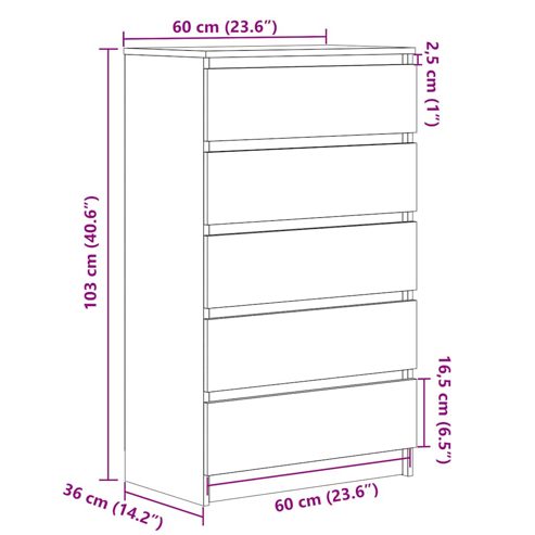 Auf der Suche nach einem stilvollen Schubladenschrank? Dieses gut gestaltete Schubladenschrank verleiht deiner Einrichtung eine elegante Note! Starkes und langlebiges Material: Holzwerkstoff ist ein langlebiges und robustes Material mit einer glatten Oberfläche, das gegen Feuchtigkeit, Verformung und Rissbildung beständig ist, wodurch es eine zuverlässigen Wahl für die Herstellung von Möbeln ist.Viel Stauraum: Mit 5 großzügigen Schubladen versehen, bietet diese Kommode reichlich Stauraum, um verschiedene Alltagssachen ordentlich und griffbereit aufzubewahren.Stabile Oberplatte: Die stabile Oberseite eignet sich perfekt zum Aufstellen von Topfpflanzen, Fotorahmen und anderen Dekorationsgegenständen.Pflegeleicht: Dank ihrer glatten Oberfläche lässt sich die Kommode mit einem feuchten Tuch leicht reinigen und erfordert wenig Pflege. Achtung:Um ein Umkippen zu vermeiden, sollte dieses Produkt mit der mitgelieferten Wandhalterung gesichert werden. ** Farbe: Schwarz Eichen-Optik ** Material: Holzwerkstoff ** Abmessungen: 60 x 36 x 103 cm (B x T x H) ** Zusammenbau erforderlich: Ja