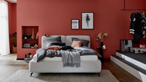 Wenn du dein Bett frei im Raum platzieren möchtest, empfiehlt sich die Ausführung mit rückseitigem Originalbezug. So wirkt dein Schlafzimmer offener und moderner. Helle Stoffe wie Naturweiß lassen Räume zusätzlich größer und ruhiger wirken.