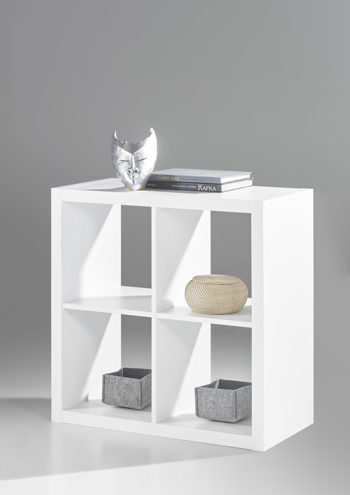 Das Standregal besticht mit einer mattierten Oberfläche in Weiß, die hervorragend Ihre Einrichtung komplettiert. Auch als Büromöbel einsetzbar, stellen Sie den Raumteiler neben den Schreibtisch und sortieren Ihre Ordner in die insgesamt vier Fächer. Das Modell ist ca. 77 x 77 x 38 cm (BxHxT) groß und hat eine Bodenstärke von ca. 16 mm.