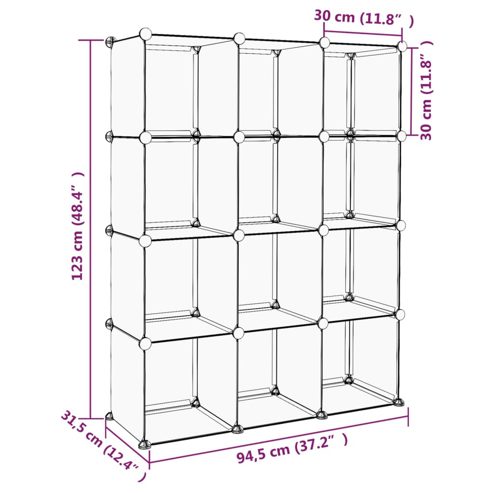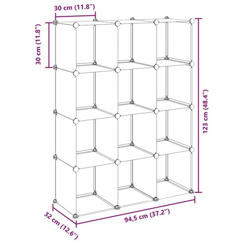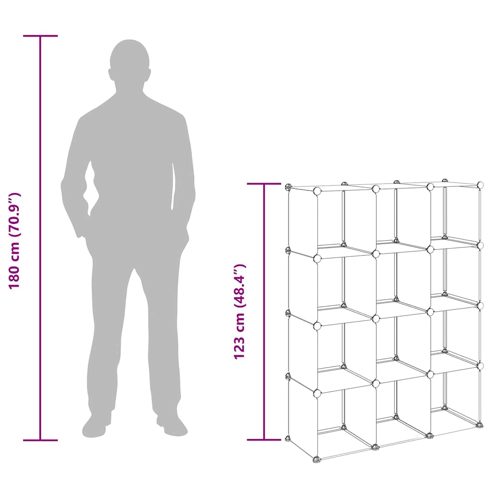 Dieses vielseitige Würfelregal nutzt begrenzten Platz optimal aus und wird Ihren unterschiedlichen Aufbewahrungsbedürfnissen gerecht. Praktisches Material: Das Regalsystem besteht aus PP-Kunststoffplatten, die wasserdicht und pflegeleicht sind.Robuste und stabile Struktur: Die Stahlrahmen sorgen für Robustheit und Stabilität.Benutzerfreundliches Design: Dank des geringen Eigengewichts lässt sich das Lagerregal nach Ihrem Geschmack mit dem mitgelieferten Holzhammer einfach zusammenbauen. Bei Nichtgebrauch können die Paneele einfach getrennt und platzsparend gestapelt werden.Viel Stauraum: Dieses Kunststoffregal enthält 12 modulare Würfel. Er bietet daher reichlich Stauraum zur ordentlichen Aufbewahrung verschiedener Sachen.Vielseitig einsetzbar: Mit seinem schlichten Design bietet das Lagerregal reichlich Stauraum und eine ausgezeichnete Aufbewahrungslösung für Ihr Zuhause, Studentenzimmer oder Büro. Hinweis:Die maximale Belastbarkeit beträgt 10 kg pro Würfel. ** Farbe: Schwarz ** Material: PP (Polypropylen), Stahl ** Gesamtabmessungen: 94,5 x 31,5 x 123 cm (L x B x H) ** Größe jedes Paneels: 30 x 30 cm (L x B) ** Maximale Belastbarkeit pro Würfel: 10 kg ** Einfache Reinigung ** 12 Lagerwürfel ** Maximale Tragfähigkeit (pro Sitz ): 110 kg ** Zusammenbau erforderlich: Ja ** Lieferung umfasst: ** 43 x Paneel ** 42 x Steckverbinder ** 1 x Holzhammer ** 1 x Anleitung