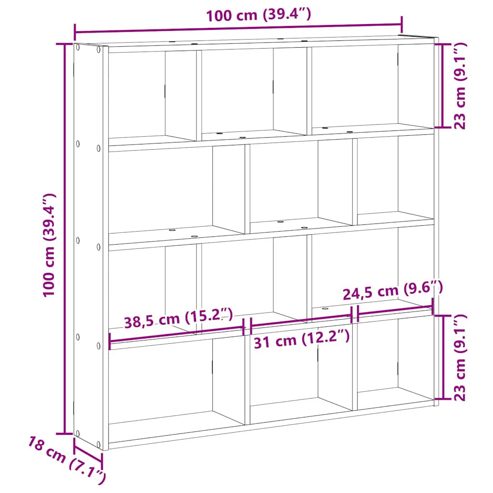 Dieses Wandregal ist sowohl eine dekorative als auch eine praktische Ergänzung zu deiner Einrichtung. Starkes und langlebiges Material: Holzwerkstoff ist ein langlebiges und robustes Material mit einer glatten Oberfläche, das gegen Feuchtigkeit, Verformung und Rissbildung beständig ist; dadurch ist es eine zuverlässige Wahl für die Herstellung von Möbeln.Reichlich Stauraum: Das Wandregal verfügt über 12 Fächer und bietet praktischen Stauraum, um verschiedene Alltagssachen übersichtlich und griffbereit aufzubewahren.Wandmontage: Das Schweberegal nimmt keine Bodenfläche in Anspruch. Du kannst ihn einfach an der Wand befestigen.Vielseitig einsetzbar: Durch sein zeitloses Design fügt sich dieses Schweberegal harmonische in deine Einrichtung ein und kann im Wohnzimmer, Schlafzimmer und jedem anderen Raum verwendet werden.Pflegeleicht: Dank seiner glatten Oberfläche lässt sich dieser Wandwürfel mit einem feuchten Tuch leicht reinigen und erfordert wenig Pflege. Gut zu wissen:Schrauben und Dübel für die Montage an der Wand sind nicht enthalten. Passendes Montagezubehör muss separat gekauft werden. Wenn du dir bezüglich der Montage nicht sicher bist, wende dich bitte an einen Fachmann. Bitte lies und befolge jeden Schritt in der Anleitung. ** Farbe: Artisan-Eiche ** Material: Holzwerkstoff ** Gesamtabmessungen: 100 x 18 x 100 cm (B x T x H) ** Abmessungen der einzelnen Fächer: 24,5/31/38,5 x 18 x 23 cm (B x T x H) ** Anzahl der Fächer: 12 ** Maximale Belastbarkeit: 60 kg ** Zusammenbau erforderlich: Ja