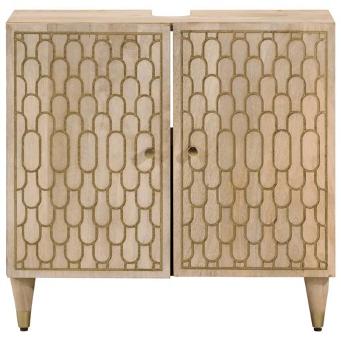 Dieser Waschbeckenunterschrank ist eine großartige Bereicherung für dein Badezimmer und verleiht ihm eine elegante Optik im Retro-Stil! Mango-Massivholz: Massives Mangoholz ist ein robustes, tropisches Hartholz, aus dem sich robuste Möbel herstellen lassen. Die optisch ansprechende Holzmaserung macht jedes Möbelstück zu einem Unikat. Der Waschbeckenschrank ist aus massivem Mangoholz gefertigt und daher langlebig und stabil.Reichlich Stauraum: Der Waschbeckenunterschrank bietet reichlich Stauraum, um wichtige Sachen ordentlich und griffbereit aufzubewahren.Praktische Oberplatte: Der Bad-Unterschrank ist oben mit einer Öffnung versehen, wodurch er sich ideal zum Aufnehmen des Waschbeckens eignet.Möbelbeine aus Holz: Die Holzbeine verleihen dem Möbelstück eine natürliche und angenehme Optik und sorgen gleichzeitig für Stabilität. Der Schrank fügt sich daher harmonisch in jede Inneneinrichtung ein.Handgeschnitztes Design: Mit einem handgeschnitzten Muster versehen, bringt der Badschrank Luxus und Eleganz in dein Interieur und wird überall ein echter Hingucker sein. Gut zu wissen:Jedes Stück ist ein Unikat, das in Farbe und Maserung variiert. Die Lieferung erfolgt in zufälliger Reihenfolge, wodurch die Exklusivität und Individualität deines Produkts gewährleistet wird. Achtung:Um ein Umkippen zu vermeiden, sollte dieses Produkt mit der mitgelieferten Wandhalterung gesichert werden. ** Material: Mango-Massivholz (gebleicht), Holzwerkstoff ** Abmessungen: 62 x 33 x 58 cm (B x T x H) ** Mit handgeschnitztem Muster ** Zusammenbau erforderlich: Ja Legal Documents: Weitere Informationen, wie Sie Ihre Möbel vor dem Umkippen schützen können, finden Sie hier