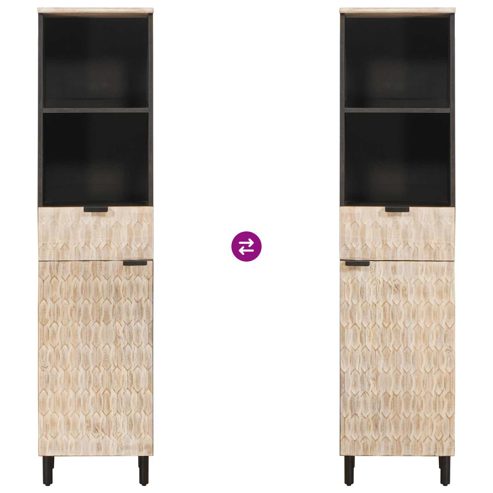 Dieser moderne Badezimmer-Schrank aus solidem Mango-Holz passt dank seines schlanken, rechteckigen Designs perfekt in jedes Badezimmer. Er kombiniert Stil und Funktionalität, sorgt für eine einladende Atmosphäre und bietet genügend Stauraum, um Platz zu schaffen. Materialien: Hergestellt aus solidem Mango-Holz, das für seine Stärke und warmen Farben bekannt ist, sorgt er für eine langlebige Ergänzung Ihres Badezimmers. Die schönen Holzmaserungen bringen Eleganz und Individualität in Ihren Raum und bieten dabei tolle Haltbarkeit. Enthaltene Komponenten: Der Schrank bietet einen pflegeleichten Entwurf mit einer Tür, die persönliche Gegenstände sichert. Die Holzoberfläche und die stabilen Montagekomponenten unterstützen die moderne Ästhetik, die in jedes zeitgemäße Badezimmerdesign passt. Funktionen / Nutzen / Design: Die rechteckige Form ist platzsparend, fügt sich gut in andere Möbel ein und maximiert den Stauraum. Seine robuste Bauweise ist sowohl funktional als auch schick, ideal für städtische Wohnungen oder luxuriöse Häuser. Empfohlene Anwendungen: Dieser Schrank ist für den Innenbereich gedacht und gut geeignet für Ordnung im Badezimmer. Lagern Sie essentielle Dinge wie Toilettenartikel und Handtücher, um eine aufgeräumte Umgebung zu schaffen. Sein elegantes Holzdesign macht ihn perfekt für Wohn- und Gästezimmer. Pflege & Wartung: Halten Sie den Schrank in top Zustand, indem Sie ihn mit einem feuchten Tuch abwischen. Eine einfache Reinigung sorgt dafür, dass die schöne Holzoberfläche langfristig aussieht wie neu, was die Langlebigkeit und den visuellen Reiz in stark frequentierten Bereichen wie im Badezimmer erhalten bleibt. ** Farbe: Schwarz und Weiß ** Material: Massivholz Mango ** Gesamtabmessungen: 38 x 33 x 160 cm (L x B x H) ** Gewicht: 24,25 kg ** Langlebig ** mit Regal ** mit Tür ** Nur für den Innenbereich ** Lieferumfang: ** 1 x Badezimmer Schrank ** Montage erforderlich: Ja