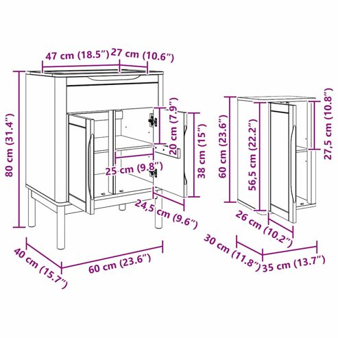 Dieses moderne Badezimmermöbelset wurde so designt, dass es jedem Badezimmer einen eleganten, nahtlosen Look verleiht. Ideal für den täglichen Gebrauch, bietet es sowohl Stil als auch praktische Funktionalität und sorgt für eine ruhige, organisierte Umgebung. Mit einer eleganten, rechteckigen Form und modernem Oberflächenfinish passt das Set super zu zeitgenössischen Dekoren. Die massiven Kiefernholz-Konstruktion bringt zeitlose Haltbarkeit. Perfekt für alle, die Einfachheit und innovative Stauraumlösungen wertschätzen, verkörpert dieses Set minimalistischen Stil, der an verschiedene Geschmäcker angepasst werden kann. Fühl dich tagtäglich in einem harmonischen Rückzugsort wohl. Massivholz Kiefer Hergestellt aus massivem Kiefernholz, bringt dieses Badezimmermöbelset eine tolle Mischung aus Stabilität und ansprechendem Design. Alles – vom Rahmen über die Griffe bis zur Rückwand – ist sorgfältig verarbeitet, um Robustheit sicherzustellen. Die schöne Maserung des Materials bringt Natur-Look in dein Badezimmer. Anpassbare Stauraumlösungen Mit verstellbaren Regalen passt sich das Möbelset perfekt an deine Stauraumbedürfnisse an. Diese Flexibilität hilft dir, all deine Essentials ordentlich zu organisieren und die Nützlichkeit deines Badezimmers zu maximieren. Modernes minimalistisches Design Mit klaren Linien und Kantengriffen verkörpert das Set moderne Eleganz. Und die Türscharniere sind auch voll funktionsfähig. Ideal für alle, die auf Funktionalität Wert legen, ohne auf Stil zu verzichten. Platzsparendes Design Das wandmontierte Design schafft mehr Platz auf dem Boden und bringt ein offenes, modernes Ambiente. Diese Lösung ist perfekt für kleinere Badezimmer oder für alle, die einen luftigen Eindruck schaffen möchten. Einfach zu pflegen Nur ein einfaches Abwischen reicht aus, um die Schönheit des Möbels zu erhalten. So kannst du es viele Jahre lang genießen, mit minimalem Aufwand. ** Farbe: Wachsbraun ** Material: Massivholz Kiefer ** Gesamtabmessungen: 35 x 30 x 160 cm (L x B x H) ** Gewicht: 46,2 kg ** Langlebig ** Stauraum ** 3 Höhenverstellungen, um deinen unterschiedlichen Aufbewahrungsbedürfnissen gerecht zu werden ** mit 1 Schublade ** mit 6 Verstellbare Regale ** Rahmenmaterial: Massivholz Kiefer ** mit 5 Scharniertüren ** Nur für den Innenbereich ** Lieferumfang: ** 1 x Waschbeckenunterschrank: 60 x 40 x 80 cm (LxBxH) ** 1 x Badezimmerunterschrank: 35 x 30 x 160 cm (LxBxH) ** 1 x Badezimmerunterschrank: 35 x 30 x 90,5 cm (LxBxH) ** 1 x Wandschrank: 35 x 30 x 60 cm (LxBxH) ** Montage erforderlich: Ja