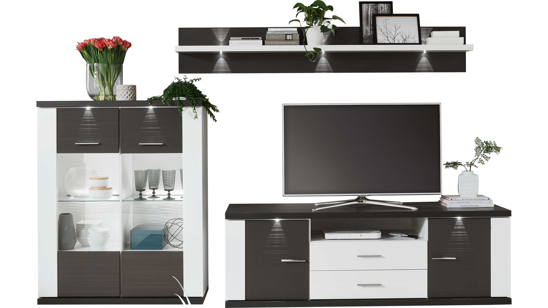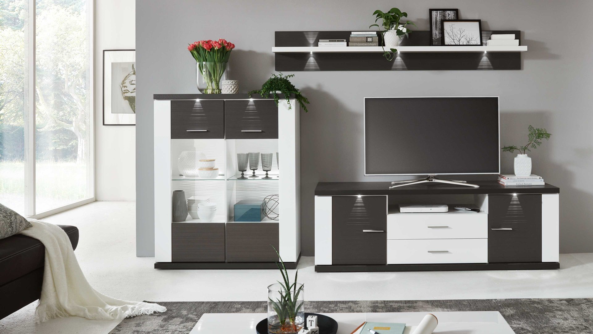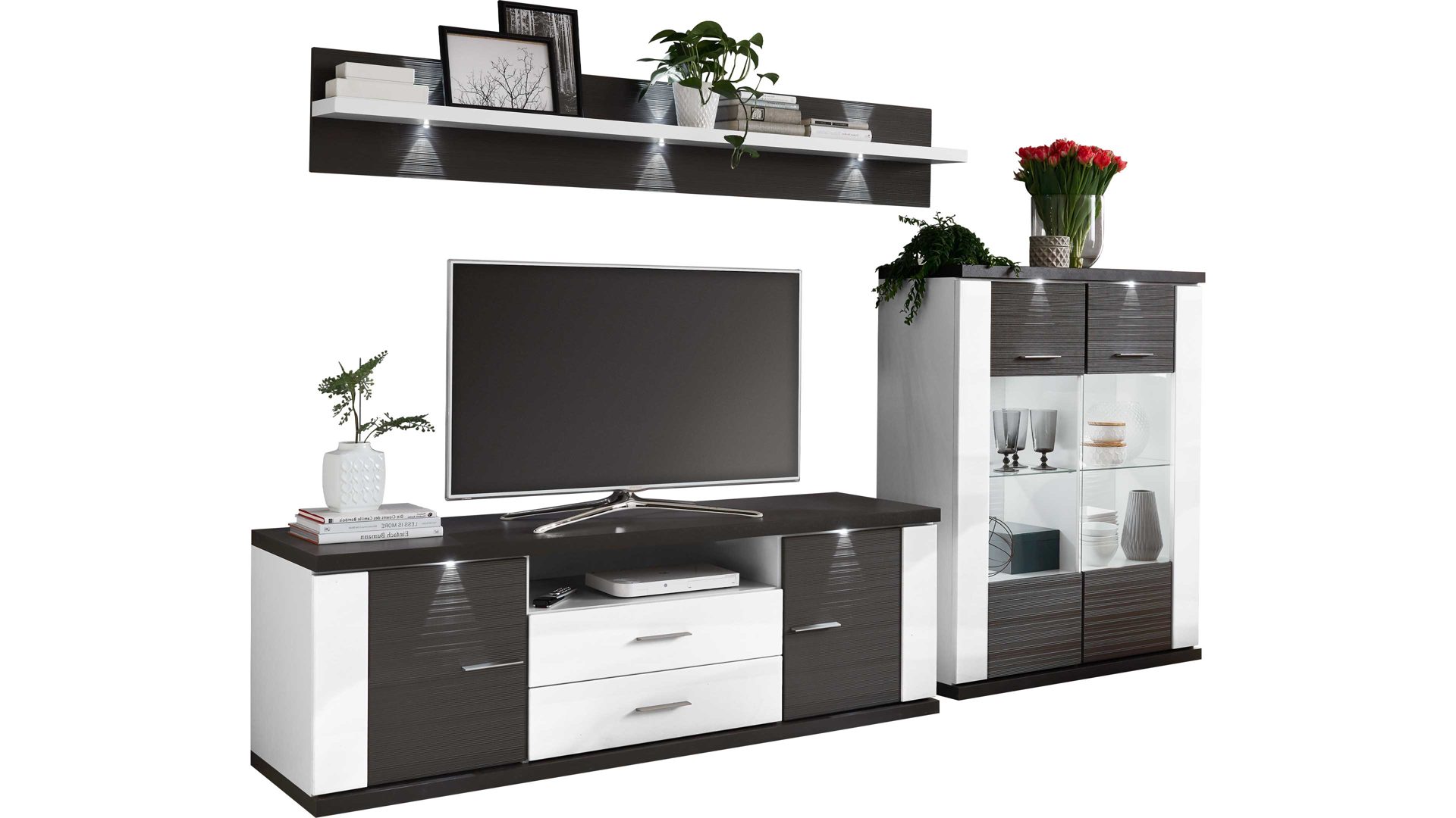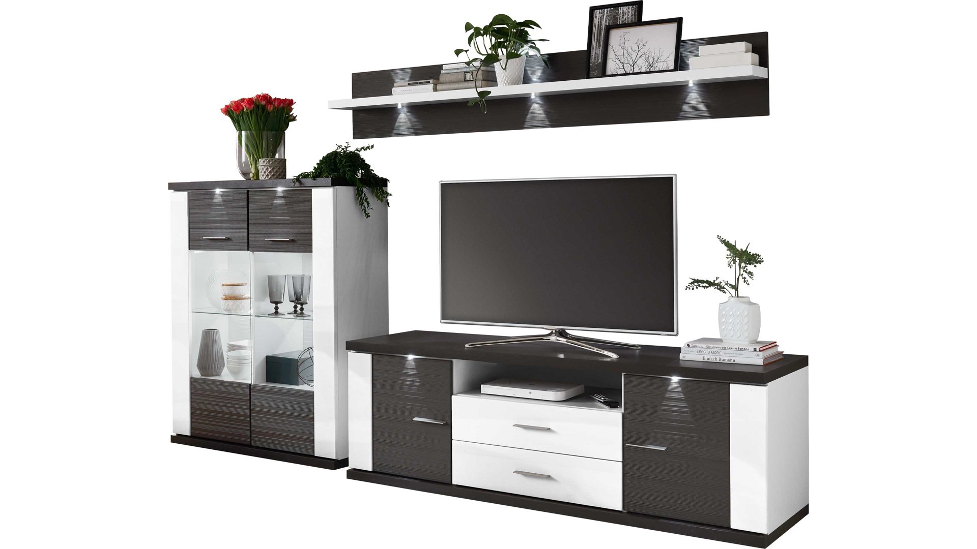 Tolle Wohnwandkombination für Ihr Zuhause: Mit arcticweißen Hochglanzfronten und graphitfarben geschroppten Absetzungen besticht diese raffinierte, dreiteilige Stauraumlösung als Wohnzimmermöbel. Die Korpusse verfügen über arcticweiße Melaminoberflächen, die nicht nur stoß- und kratzfest, sondern auch lichtbeständig sind. Die ca. 294 x 180 x 52 cm (BxHxT) große Wohnkombination besteht aus einem Highboard, dessen zwei Türen Glasausschnitte, vier Holzböden und zwei Glasböden haben; ein Wandregal mit graphitfarbener Rückwand und arcticweißem regalboden und einem Lowboard, hinter dessen zwei Türen und in zwei Schubladen Sie allerhand verstauen können. In diesen Aufbewahrungsmöbeln bringen Sie Gläser, Vasen, Bücher und Wohnaccessoires ordentlich und staubfrei unter. Ihren Fernseher platzieren Sie mittig auf dem TV-Unterteil.