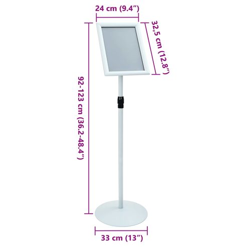 Der langlebige Podest-Plakatständer ist eine flexible Lösung, die speziell für geschäftliche und industrielle Umgebungen entwickelt wurde. Dieses moderne Ausstellungsstück kombiniert Funktionalität mit Stil und verfügt über ein minimalistisches Design, klare Linien und hohe Funktionalität. Mit seiner eleganten schwarzen Oberfläche integriert sich dieser Podestständer mühelos in jedes Büro oder jeden Einzelhandelsbereich. Perfekt zum Präsentieren von Werbematerialien oder wichtigen Hinweisen, spricht er Profi an, die nach einer verlässlichen Ausstellungsoption suchen, die Form und Funktion einfach verbindet. Hochwertige Materialien: Der Ständer ist aus hochwertigem Aluminium und PVC gefertigt und ist sowohl wasser- als auch UV-beständig. Diese Materialwahl sorgt dafür, dass er sein Aussehen und seine Stabilität auch bei extremen Wetterbedingungen behält und ein langlebiges Werkzeug für Firmen bietet, die stabile und effektive Displays brauchen. Verstellbare Höhe: Der manuell verstellbare Mechanismus ermöglicht es Nutzern, die Höhe des Ständers ganz einfach an die unterschiedlichen Displaybedürfnisse anzupassen. Diese Flexibilität hilft Organisationen, sich an verschiedene Displaygrößen und -formate anzupassen und steigert so die Gesamtnützlichkeit und Vielseitigkeit für diverse Anwendungen. Robustes Design: Dank einer schweren Metallbasis garantiert der Ständer außergewöhnliche Stabilität und Robustheit. Seine schlanke Form verstärkt die moderne Ästhetik und fügt sich nahtlos in Büros oder Verkaufsräume ein. Ausstellungsunterlagen bleiben fest am Platz, was eine ansprechende Präsentation wichtiger Informationen sicherstellt. Innen- und Außeneinsatz: Der Podestständer ist für den Einsatz in verschiedenen Umgebungen konzipiert und funktioniert sowohl drinnen als auch draußen wunderbar. Diese Vielseitigkeit ist ideal für Unternehmen, die Lösungen suchen, die wechselhaftes Wetter aushalten und dabei visuelle Anziehungskraft und Praktikabilität behalten. Einfache Wartung: Mit einer glatten Oberfläche, die Schmutz und Dreck abweist, reicht es, den Ständer gelegentlich mit einem trockenen Tuch abzuwischen, um seinen Glanz zu behalten. Diese einfache Pflege verlängert die Lebensdauer und sorgt dafür, dass er ein zentraler Bestandteil für verschiedene gewerbliche Zwecke bleibt. ** Farbe: Silber ** Material: PVC und Stahl ** Gesamtabmessungen: 33 x 33 x 123 cm (L x B x H) ** Gewicht: 2,8 kg ** Höhenverstellbar ** Robuster Metallbasis ** Langlebige Nutzung ** Einfach zu wechselnde Poster ** 360° nach links und rechts drehbar ** 180° nach oben und unten neigbar ** Breite Anwendung ** Klarer Posterdisplay ** Verstellbare Min/Max Maße: 92-123 cm ** Rahmenmaterial: Aluminium ** Für Innen- und Außenbereich ** Lieferumfang: ** 1 x Schildhalterständer ** Montage erforderlich: Ja
