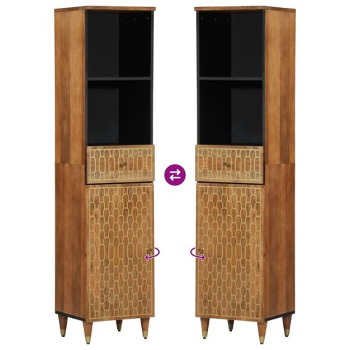 Dieses praktische Badmöbel-Set mit geräumigem Stauraum ist eine hervorragende Ergänzung für dein Badezimmer und verleiht ihm ein aufgeräumtes und eindrucksvolles Aussehen! Massives Mangoholz: Massives Mangoholz ist ein starkes, tropisches Hartholz, aus dem robuste Möbelstücke hergestellt werden. Die optisch ansprechende Holzmaserung macht jedes Möbelstück zu einem Unikat. Viel Stauraum: Der Badezimmerschrank aus Holz bietet verschiedene Aufbewahrungsmöglichkeiten und viel Platz für die Aufbewahrung verschiedener Sachen in deinem Badezimmer. Platzsparendes Design: Der Badspiegel lässt sich an der Wand befestigen, um Bodenfläche zu sparen. Die Oberplatte des Badschrank bietet den idealen Platz für das Waschbecken. So kannst du auch den freien Platz unter dem Waschbecken optimal ausnutzen. Klares Spiegelbild: Die Spiegelfläche aus Glas bietet eine feine und unverzerrte Spiegelung, sodass sie sich zum Schminken, Rasieren oder Gesichtspflege eignet. Achtung:Um ein Umkippen zu vermeiden, sollte dieses Produkt mit der mitgelieferten Wandhalterung gesichert werden. Gut zu wissen:Jedes Stück ist ein Unikat, das in Farbe und Maserung variiert. Die Lieferung erfolgt in zufälliger Reihenfolge, wodurch die Exklusivität und Individualität deines Produkts gewährleistet wird. Schrauben und Dübel für die Montage an der Wand sind nicht enthalten. Passendes Montagezubehör muss separat gekauft werden. Wenn du dir bezüglich der Montage nicht sicher bist, wende dich bitte an einen Fachmann. Bitte lies und befolge jeden Schritt in der Anleitung. ** Waschbeckenunterschrank: ** Material: Massives Mangoholz mit honigbraunem Finish, Holzwerkstoff, Eisen ** Abmessungen: 62 x 33 x 58 cm (L x B x H) ** Mit handgeschnitztem Muster ** Badezimmerschrank: ** Material: Massives Mangoholz mit honigbraunem Finish, Holzwerkstoff, Eisen ** Abmessungen: 38 x 33 x 160 cm (L x B x H) ** Mit handgeschnitztem Muster ** Spiegel: ** Material: Massives Mangoholz mit honigbrauner Lackierung, Glas ** Abmessungen: 50 x 70 x 2,5 cm (L x B x T) ** Mit handgeschnitztem Muster ** Zusammenbau erforderlich: Ja ** Lieferung umfasst: ** 1 x Waschbeckenunterschrank ** 1 x Badezimmerschrank ** 1 x Spiegel Legal Documents: Weitere Informationen, wie Sie Ihre Möbel vor dem Umkippen schützen können, finden Sie hier