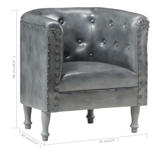 Dieser luxuriöse Armsessel mit stilvollem Design wird ein Blickfänger in jedem Zimmer sein. Er bietet die perfekte Sitzlösung für Ihre Familie zum Chatten, Lesen, Fernsehen oder einfach nur Entspannen. Der Clubsessel ist mit weichem, echtem Ziegenleder bezogen und auch dick gepolstert, um höchsten Komfort zu bieten. Die Beine aus massivem Mangoholz sind sehr stabil und langlebig. Mit seinen elegant geschwungenen Linien bringt dieser Armsessel einen luxuriösen Charme, Eleganz und Stil in jede Inneneinrichtung. Der Sessel ist einfach zu montieren. ** Farbe: Grau ** Material: Echtes Ziegenleder, massives Mangoholz ** Abmessungen: 61 x 60 x 68 cm (B x T x H) ** Poliert, gestrichen und lackiert ** Zusammenbau erforderlich: Ja Maximal 110 kg pro Sitzplatz.