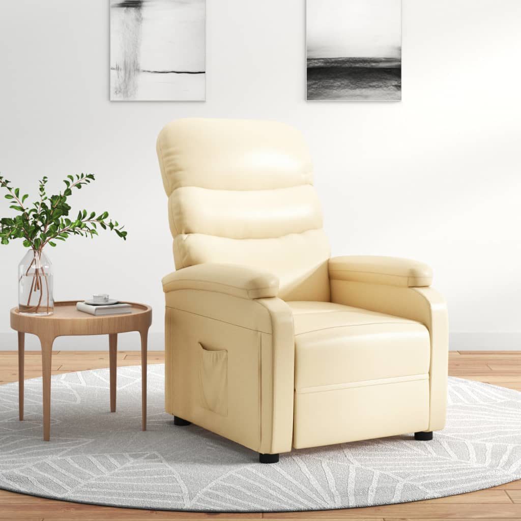 Lehne sich zurück und entspanne sich in diesem äußerst bequemen Relaxsessel! Manuelle Liegefunktion: Der Sessel kann manuell in 3 Positionen verstellt werden, so dass die Rückenlehne und der Fußteil je nach Bedarf eingestellt werden können.Bequemes Sitzerlebnis: Der dick gepolsterte Sitz, die Rückenlehne und die breiten, mit Kunstleder bezogenen Armlehnen sorgen für ein behagliches und angenehmes Sitzgefühl. Künstliches Leder ist ein äußerst langlebiges Material. Es ist schmutzabweisend und lässt sich mit einem feuchten Tuch einfach reinigen. Durch die glatte Oberfläche weist es die luxuriöse Schönheit von Echtleder auf.Solider und stabiler Rahmen: Der Rahmen aus Holz und Metall sorgt für eine solide Struktur und hohe Stabilität. Dieser TV-Sessel ist bequem und langlebig. ** Farbe: Creme ** Material: Kunstleder (60% Polyurethan, 30% Polyester, 10% Baumwolle), Sperrholz, Eisen ** Füllung: Schaumstoff ** Abmessungen (Sitzposition): 75 x 91 x 101 cm (B x T x H) ** Abmessungen in Liegeposition: 75 x 138,5 x 84 cm (B x T x H) ** Sitzgröße: 50 x 50 cm (B x T) ** Sitzhöhe vom Boden: 45 cm ** Armlehnenhöhe vom Boden: 62 cm ** Verstellbare Rückenlehne und Fußstütze ** Max. Belastbarkeit: 110 kg ** Zusammenbau erforderlich: Ja