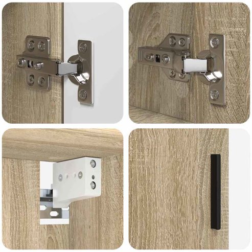Das moderne Badezimmermöbelset ist die perfekte Mischung aus Funktionalität und Stil für heutige Wohnräume. Mit seinem schlanken Design und den glatten Oberflächen passt es super in jedes moderne Badezimmer oder Flur. Für alle, die minimalistische Vibes mögen, kombiniert dieses Set Praktikabilität und Eleganz mit praktischen Stauraumlösungen, ohne viel Platz wegzunehmen. Das Design sorgt dafür, dass alles einfach zu bedienen ist, sodass deine täglichen Routinen zum Kinderspiel werden. Holzwerkstoff-Bau Das Möbelset ist aus hochwertigem Holzwerkstoff gemacht und hält täglichem Verschleiß stand. Es ist stabil gebaut und bietet dir einen zuverlässigen Stauraum für beschäftigte Haushalte oder Büros. Moderne Metallgriffstangen Diese coolen Griffstangen im klaren Design sehen schick aus und machen das Öffnen und Schließen der Türen leicht, selbst bei der Feuchtigkeit in Badezimmern. Wandmontiertes Design Mit der wandmontierten Bauweise bleibt der Boden frei, und der Platz wird optimal ausgenutzt – ideal für kleinere Bereiche. Die Montage ist einfach und sorgt für ein funktionales Setup, das perfekt für ein aufgeräumtes Badezimmer ist. Geräumiger Stauraum Das großzügige Innere hilft dir, deine Essentials ordentlich zu verstauen. Praktisch für persönliche Sachen wie Pflegeprodukte oder Badutensilien, damit alles griffbereit und ordentlich bleibt. Einfache Pflege Halte deine Möbel glänzend, indem du sie mit einem feuchten Tuch abwischst. Diese schnelle Pflegeroutine ist einfach und gibt dir mehr Zeit, den modernen Charme zu genießen. ** Farbe: Sonoma-eiche ** Material: Holzwerkstoff ** Gesamtabmessungen: 61 x 35 x 64 cm (L x B x H) ** Gewicht: 28.35 kg ** Langlebig ** Mit flachspiegel spiegel ** Rahmenmaterial: Holzwerkstoff ** Mit 3 türen ** Innen- / außenbereich: Nur für drinnen ** Lieferumfang: ** 1 x Badezimmer Waschbecken-Schrank ** 1 x Badezimmer Spiegel-Schrank ** Anzahl artikel: 2 ** Montage erforderlich: Ja
