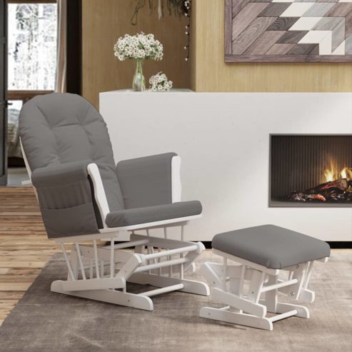 Entspanne dich und genieße deine Freizeit auf diesem stylischen Schaukelsessel mit Hocker! Gleitfunktion: Der Relaxsessel und der mitgelieferte Fußhocker lassen sich hin und her bewegen und eignen sich somit ideal zum Füttern und Beruhigen deines Babys. Breite Anwendung: Dieser Schaukelstuhl lässt sich überall im Haus einsetzen, sei es im Kinderzimmer, um dich um dein Baby zu kümmern, oder im Wohn- bzw. Schlafzimmer zum Entspannen.Langlebiges Material: Massives Kautschukholz ist ein wunderschönes Naturmaterial. Kautschukholz besitzt eine dichte Maserung und ist stoßfest und langlebig. Stoff weist eine schlichte und saubere Optik auf und ist auch atmungsaktiv und langlebig.Bequemes Sitzerlebnis: Der Schaukelsessel ist mit dicken Kissen und gepolsterten Armlehnen versehen, um höchsten Komfort zu bieten.Praktisches Design: Dieser gleitende Schaukelstuhl verfügt über Seitentaschen, in denen du kleine Gegenstände in Reichweite aufbewahren kannst. Gut zu wissen:Um die Montage so einfach wie möglich zu machen, wird jedes Produkt mit einer Anleitung geliefert. ** Stofffarbe: Dunkelgrau ** Rahmenfarbe: Weiß ** Material: Stoff (100 % Polyester), massives Kautschukholz ** Abmessungen des Stuhls: 70 x 72 x 107 cm (B x T x H) ** Abmessungen des Hockers: 49 x 39 x 34 cm (B x T x H) ** Sitzbreite: 56 cm ** Sitztiefe: 46 cm ** Sitzhöhe vom Boden: 45 cm ** Maximale Tragfähigkeit (pro Sitz ): 110 kg Maximal 110 kg pro Sitzplatz. Achte auf die Gefahr von offenem Feuer und anderen starken Wärmequellen in der Nähe des Produkts.
