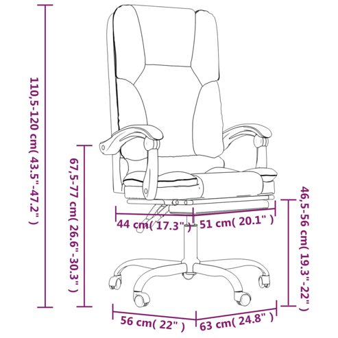 Mit seinem minimalistischen Design vereint dieser trendige Massage-Bürostuhl Eleganz und Komfort und ist ein echter Hingucker in deinem Arbeitsbereich. Langlebiges Kunstleder: Hochwertiges Kunstleder ist ein äußerst langlebiges Material. Es ist schmutzabweisend und lässt sich mit einem feuchten Tuch einfach reinigen. Durch die glatte Oberfläche weist es die Schönheit von Echtleder und einen luxuriösen Look auf.Hohe Flexibilität: Benutze den Hebel, um die Höhe des Stuhls nach Belieben einzustellen. Außerdem ist der Bürostuhl um 360 Grad drehbar und lässt sich dank der Rollen bequem bewegen.Verstellbare Rückenlehne und Fußstütze: Dank der verstellbaren Rückenlehne und Fußstütze findest du stets eine optimale Position und einen optimalen Blickwinkel, um höchsten Komfort zu genießen.Massagefunktion: Dieser verstellbare Bürostuhl ist mit einem Massagepunkt an der Rückenlehne versehen, um für mehr Entspannung beim Spielen oder stundenlangen Arbeiten zu sorgen.Stabil und robust: Die Gestelle aus Metall und Sperrholz sorgen für Robustheit und Stabilität. Gut zu wissen:Jedes Produkt wird mit einer Montageanleitung in der Verpackung für eine einfache Montage geliefert.Das Produkt verfügt über einen USB-Anschluss, aber die zertifizierte 5-V-USB-Stromquelle ist nicht im Lieferumfang enthalten. ** Farbe: Braun ** Material: Kunstleder (75% Polyvinylchlorid, 5% Baumwolle, 20% Polyester), Metall, Sperrholz ** Füllmaterial: Schaumstoff ** Gesamtmaße: 63 x 56 x (110,5-120) cm (B x T x H) ** Liegemaße: 63 x 128,5 x (98-107,5) cm (B x T x H) ** Sitzgröße: 51 x 44 cm (B x T) ** Sitzhöhe vom Boden: 46,5-56 cm ** Armlehnenhöhe vom Boden: 67,5-77 cm ** Mit Massagepunkt auf der Rückseite ** Verstellbare Rückenlehne und Fußstütze ** Gasdruckfedermechanismus ** 360-Grad schwenkbar ** Inklusive Rollen ** Eingangsspannung: DC 5 V ** Eingangsstrom: 2 A ** Maximale Tragkraft (pro Sitz): 110 kg Achte auf die Gefahr von offenem Feuer und anderen starken Wärmequellen in der Nähe des Produkts. Maximal 110 kg pro Sitz. Dieses Produkt wird mit 5 V Gleichstrom betrieben, aber die zertifizierte 5-V-USB-Stromquelle ist nicht im Lieferumfang enthalten. Eine höhere Spannung kann zu einer Überhitzung führen und das Gerät beschädigen sowie das Risiko einer Überhitzung und eines Brandes bergen.