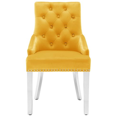 Verleihen Sie Ihrer Inneneinrichtung mit diesen Esszimmerstühlen sofort eine beeindruckende Note! Diese Küchenstühle sind mit weichem Samt bezogen und mit dickem Schaumstoff gepolstert, wodurch sie bequem sind. Der Holzrahmen und die Edelstahlfüße sorgen für hohe Robustheit und Stabilität. Darüber hinaus verleihen die dekorativen Knöpfe dem Stuhl ein schönes Design. ** Farbe: Gelb ** Material: Samt (100% Polyester), Edelstahl, verschiedene Hölzer, Mehrschichtplatte ** Füllung: Schaumstoff ** Gesamtmaße: 52 x 62 x 94 cm (B x T x H) ** Sitzbreite: 52 cm ** Sitztiefe: 45 cm ** Sitzhöhe vom Boden: 50 cm ** Max. Tragfähigkeit: 110 kg ** Zusammenbau erforderlich: Ja ** Lieferung enthält: ** 2 x Esszimmerstuhl Maximal 110 kg pro Sitzplatz. Achte auf die Gefahr von offenem Feuer und anderen starken Wärmequellen in der Nähe des Produkts.
