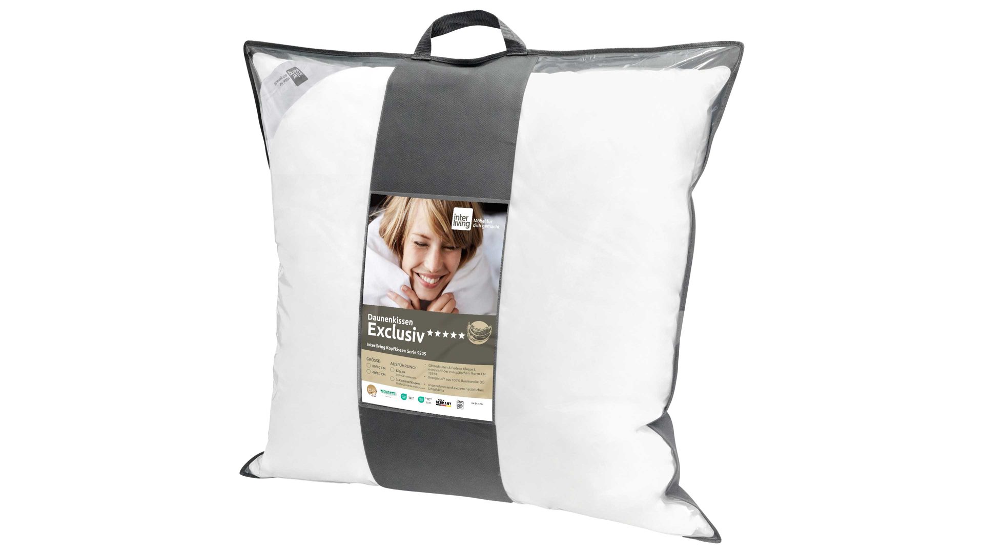 Das Interliving Kopfkissen Serie 9205 erfüllt den OEKO-TEX® Standard 100 und trägt das Nomite-Zertifikat – es ist also auch für Hausstauballergiker bestens geeignet. Du kannst das Kissen bei bis zu 60 °C in der Maschine waschen und anschließend im Trockner schonend durchtrocknen, damit die edle Daunenfüllung luftig und formstabil bleibt. Besonders praktisch: Die atmungsaktive Tragetasche ist bereits inklusive – ideal für Aufbewahrung oder Reisen.